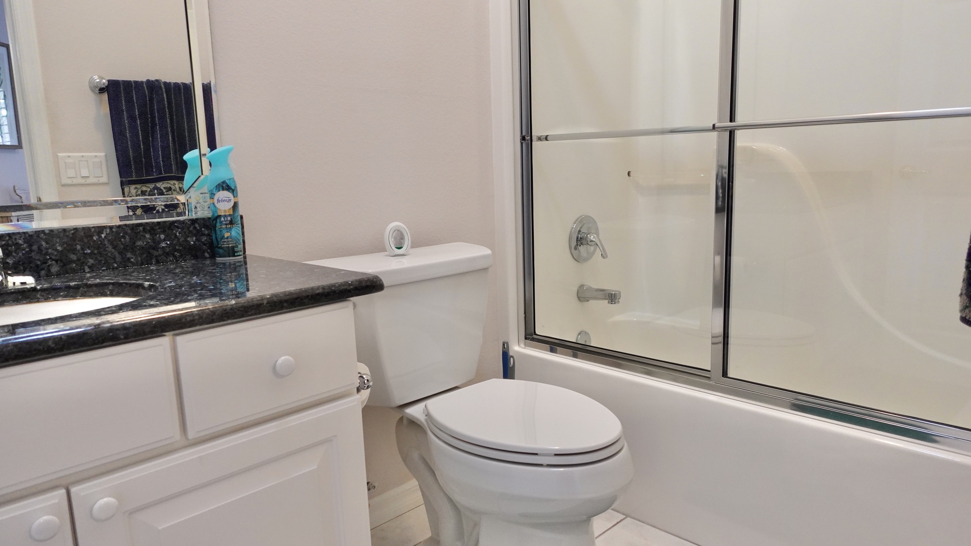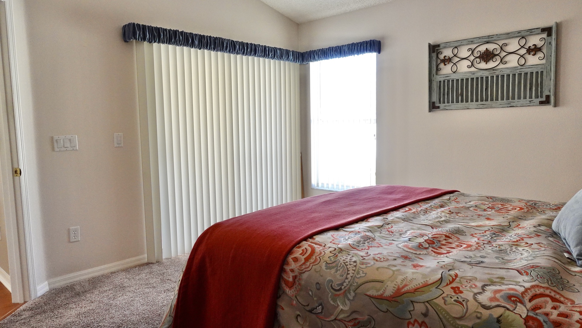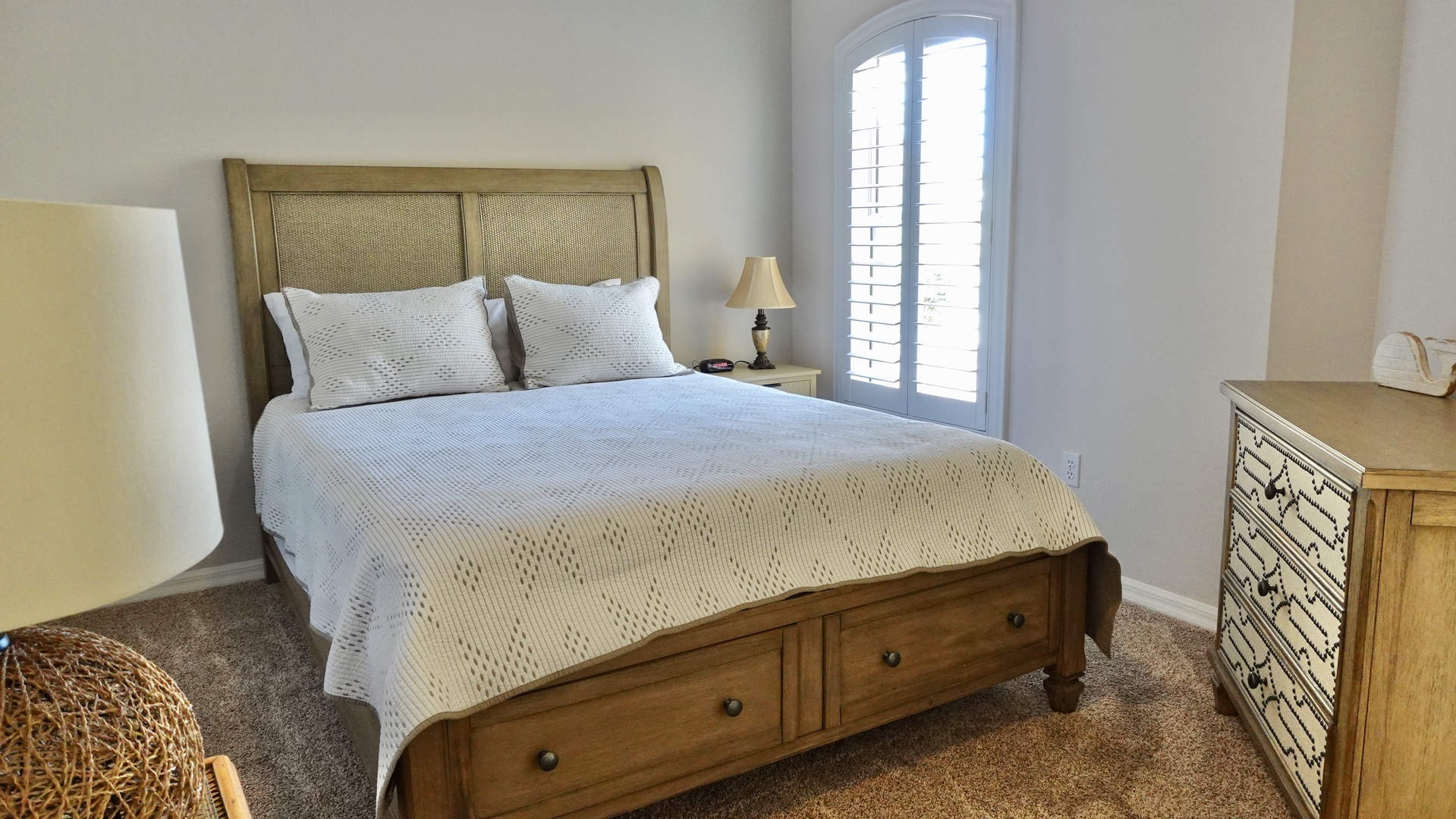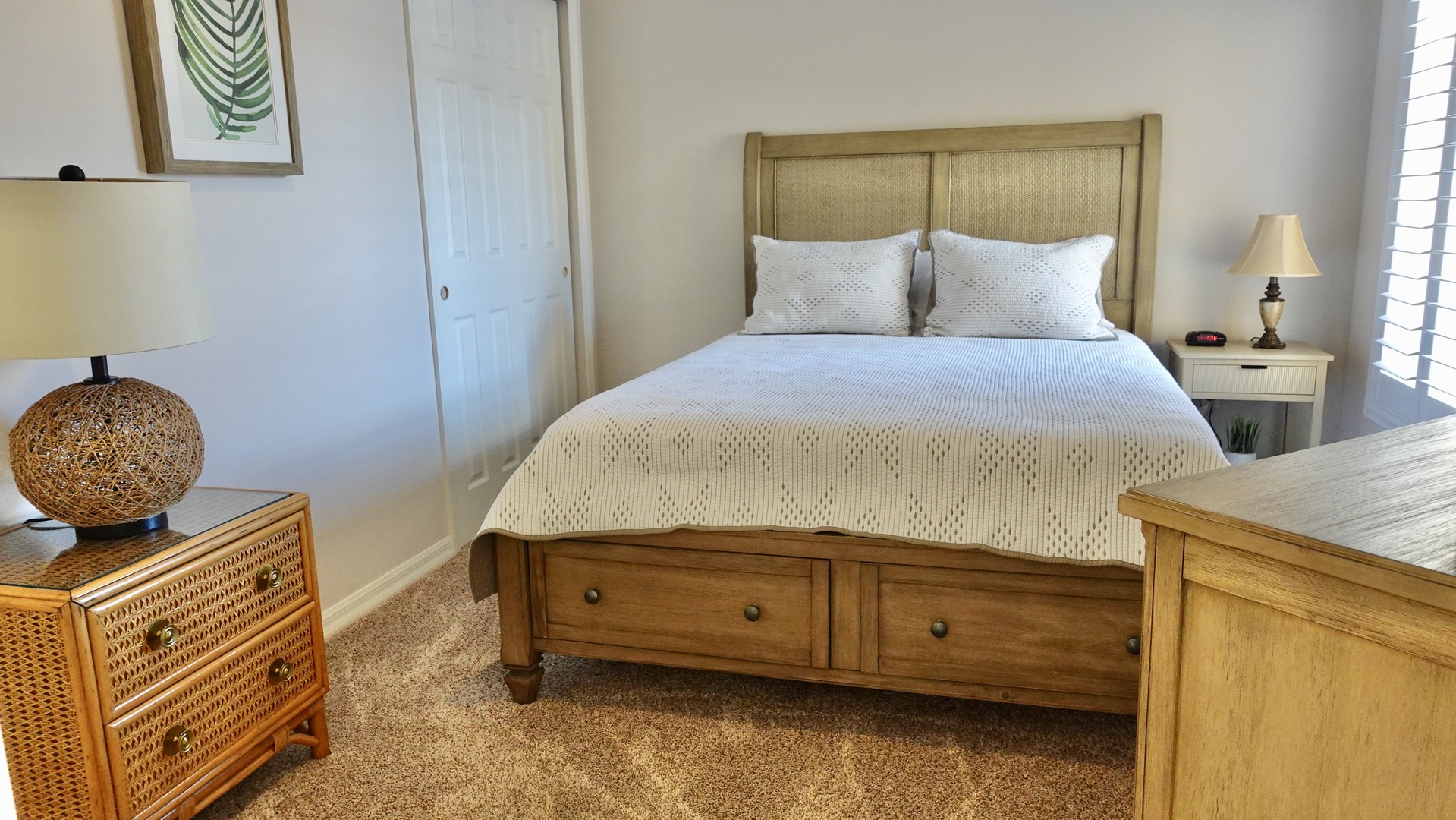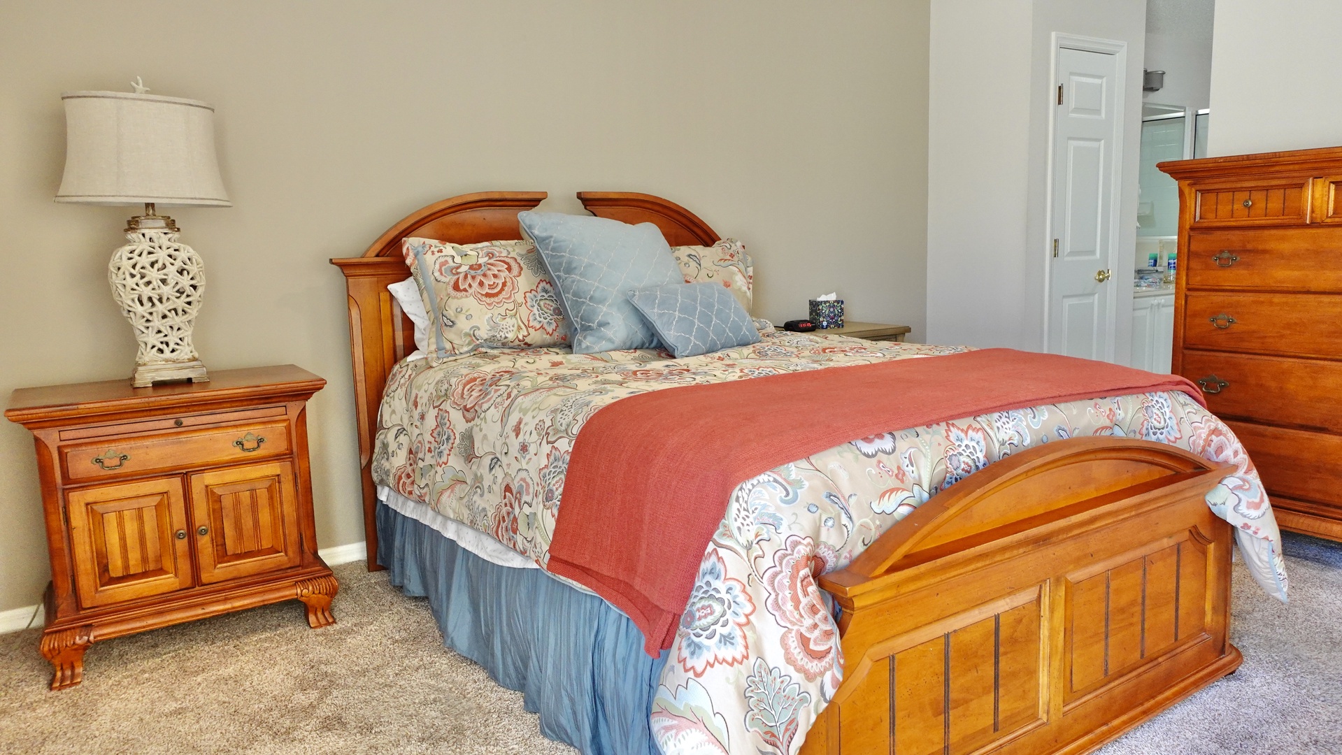 The guest bedroom offers a queen-size bed, carpeted flooring, and its own private bathroom with a tub, ensuring comfort and privacy for visitors.