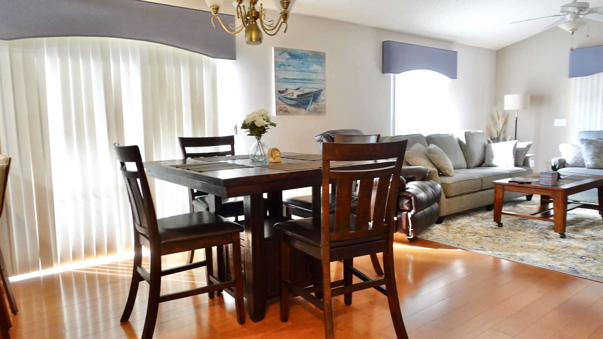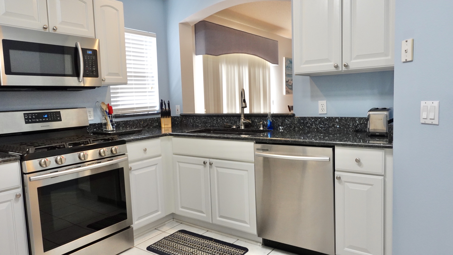 The well-equipped kitchen boasts marble countertops, a gas stove, a deep-set sink, bar seating for two, and a dining table with seating for four, making it ideal for both casual meals and entertaining.