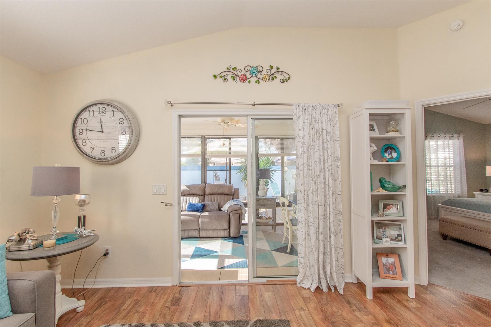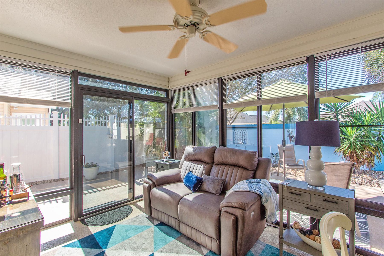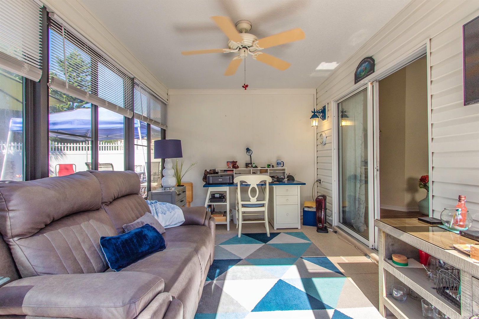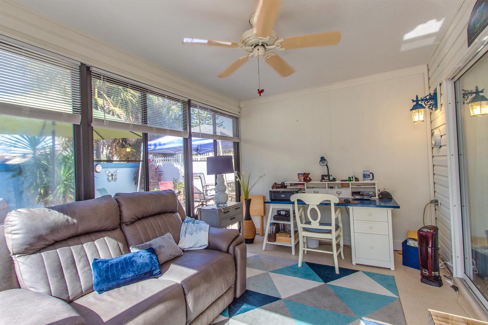 The well-appointed kitchen is perfect for preparing meals or enjoying intimate dinners, equipped with everything needed to inspire culinary creations. Adjacent, the dining area comfortably seats four and seamlessly connects to the living room featuring a plush sectional sofa and Smart TV. Just beyond lies the enclosed Lanai—an ideal spot to curl up with a good book or savor a morning coffee. Need to catch up on work? A dedicated desk area is provided.