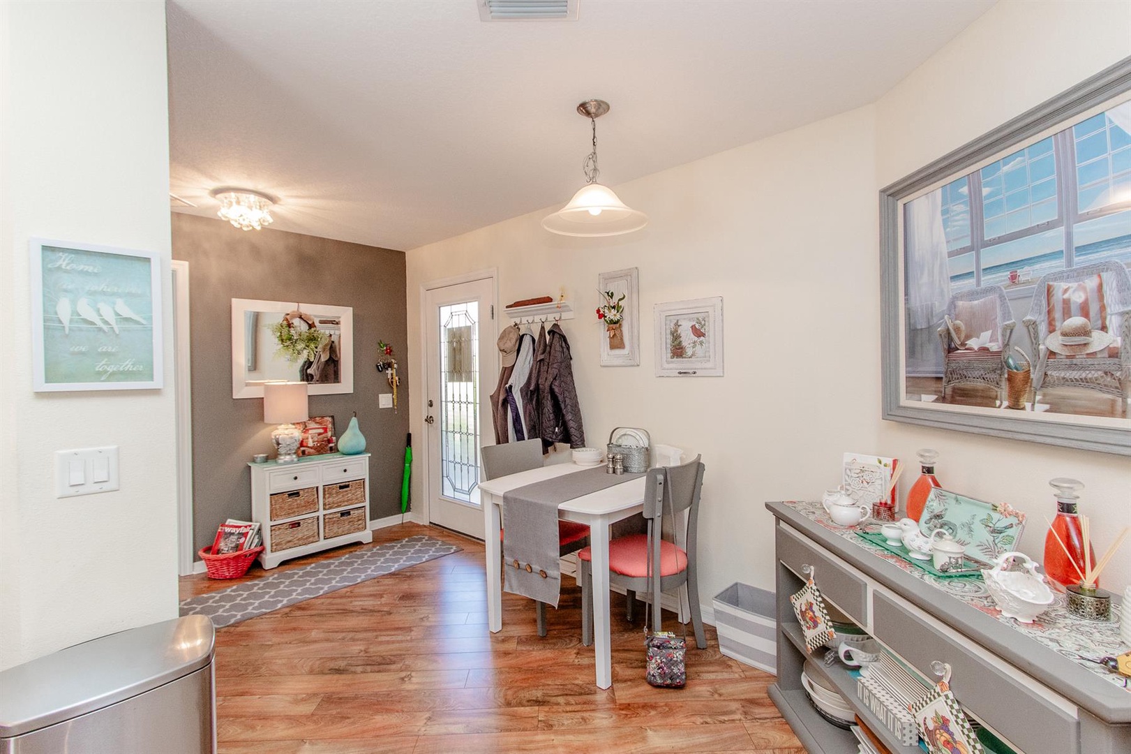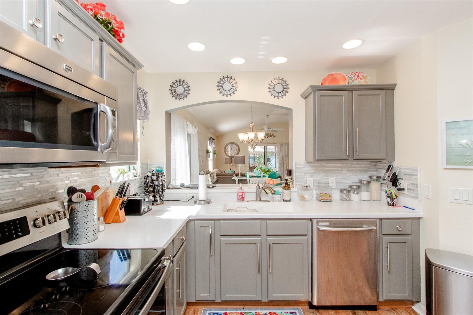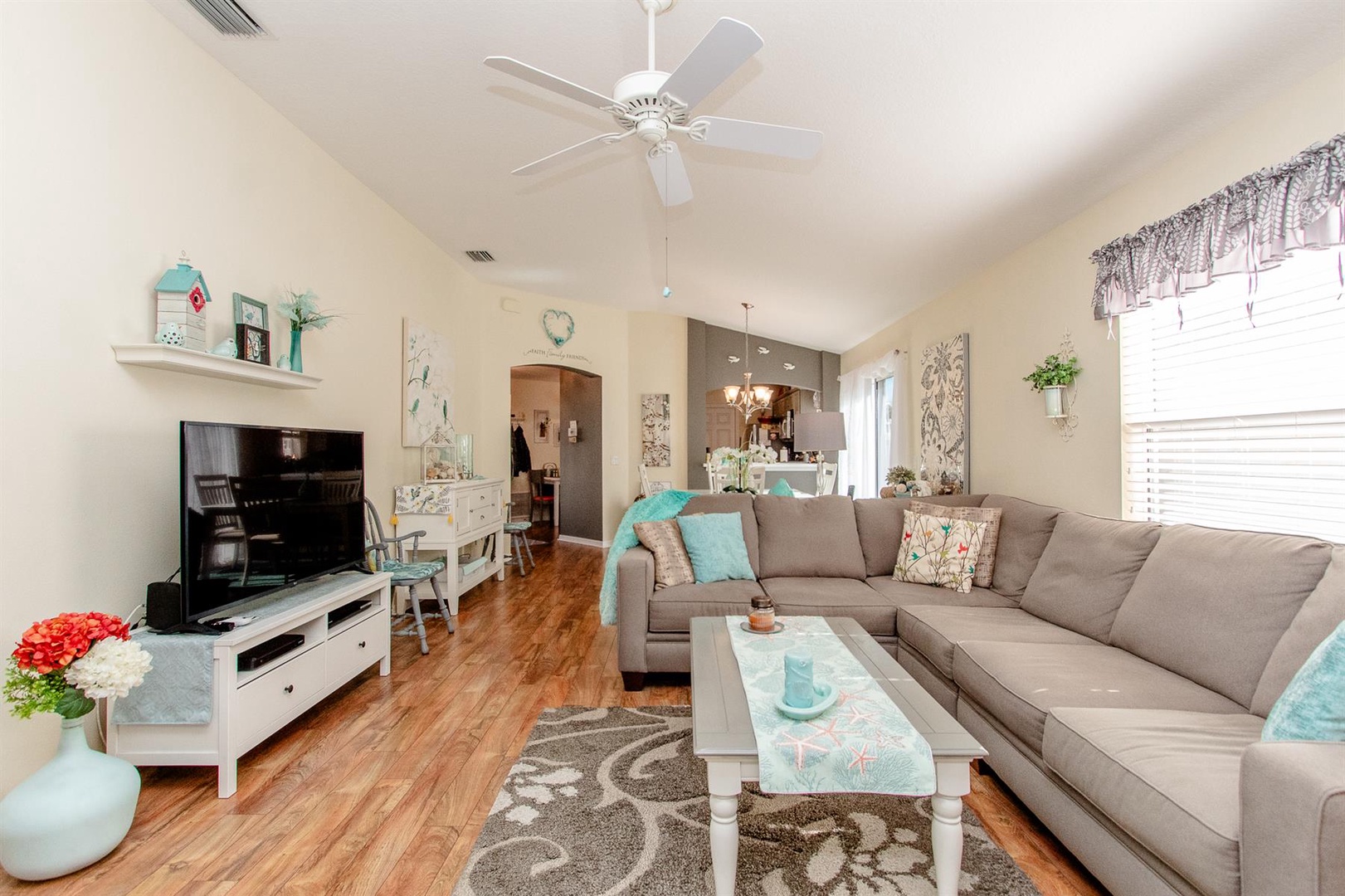 The well-appointed kitchen is perfect for preparing meals or enjoying intimate dinners, equipped with everything needed to inspire culinary creations. Adjacent, the dining area comfortably seats four and seamlessly connects to the living room featuring a plush sectional sofa and Smart TV. Just beyond lies the enclosed Lanai—an ideal spot to curl up with a good book or savor a morning coffee. Need to catch up on work? A dedicated desk area is provided.