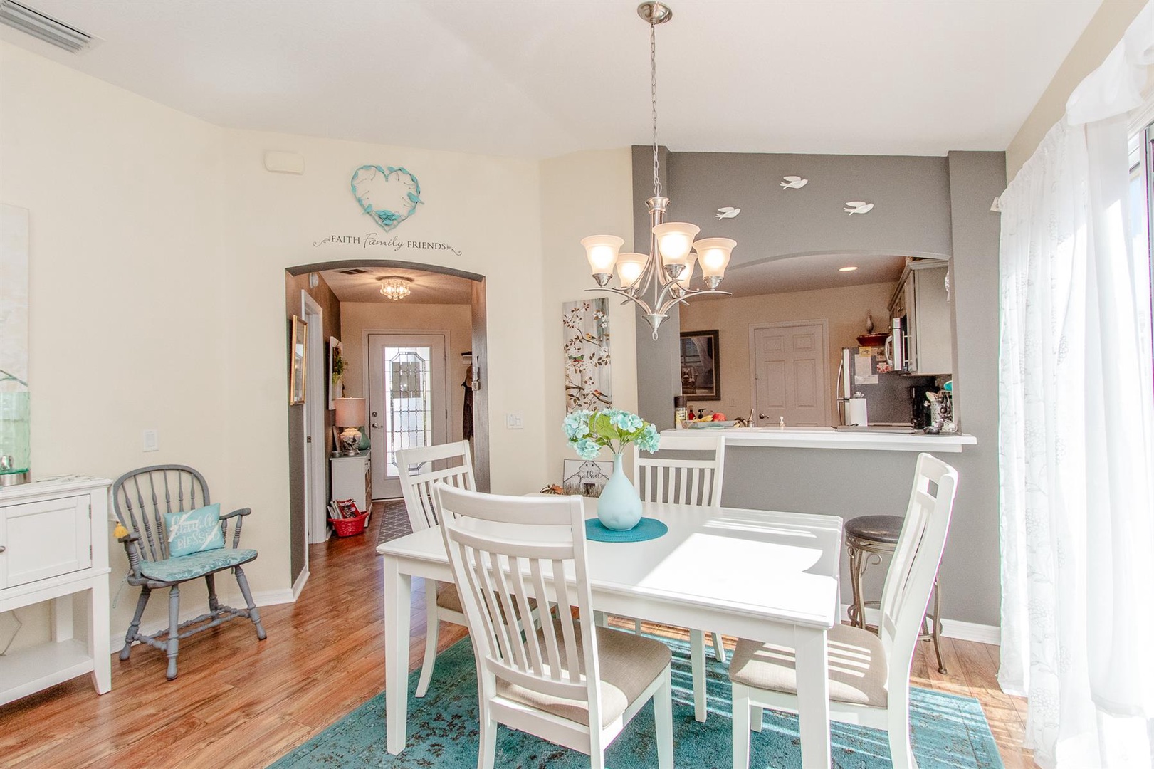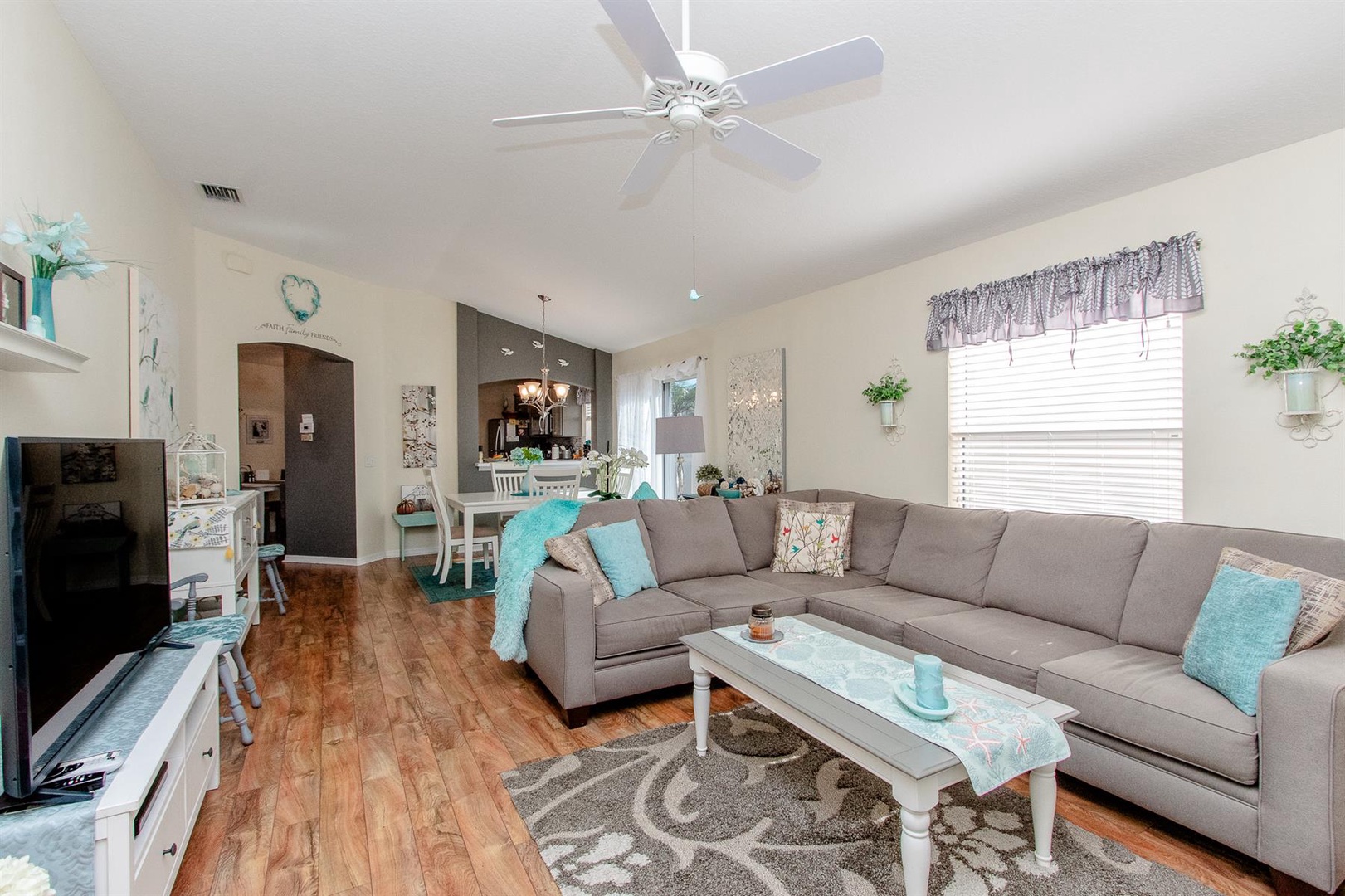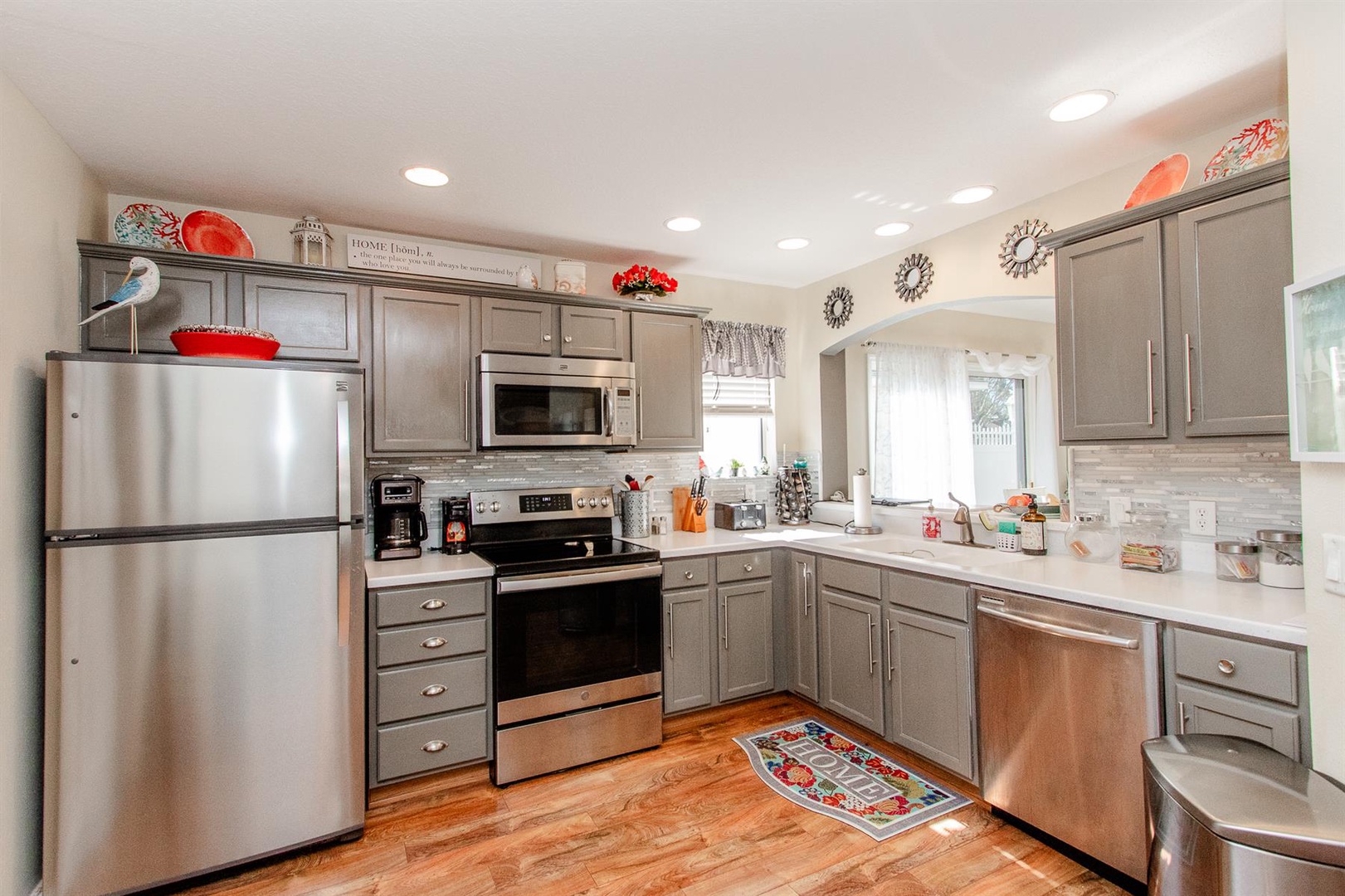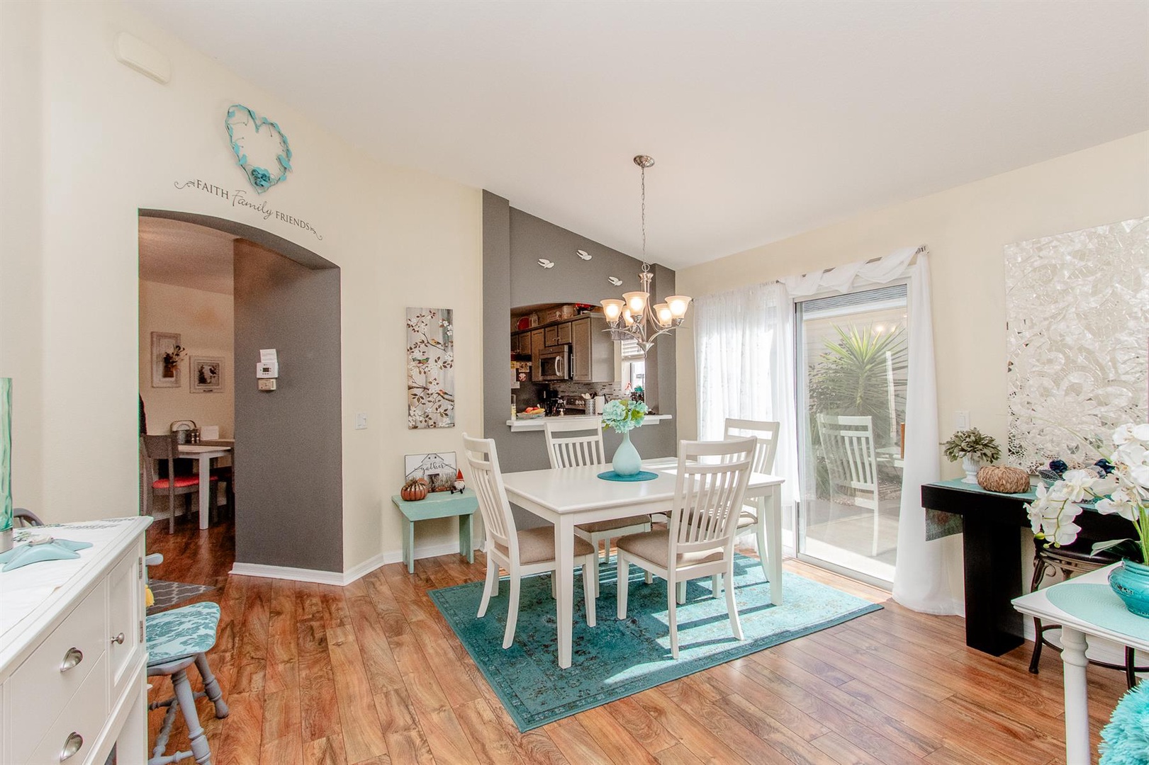 The well-appointed kitchen is perfect for preparing meals or enjoying intimate dinners, equipped with everything needed to inspire culinary creations. Adjacent, the dining area comfortably seats four and seamlessly connects to the living room featuring a plush sectional sofa and Smart TV. Just beyond lies the enclosed Lanai—an ideal spot to curl up with a good book or savor a morning coffee. Need to catch up on work? A dedicated desk area is provided.