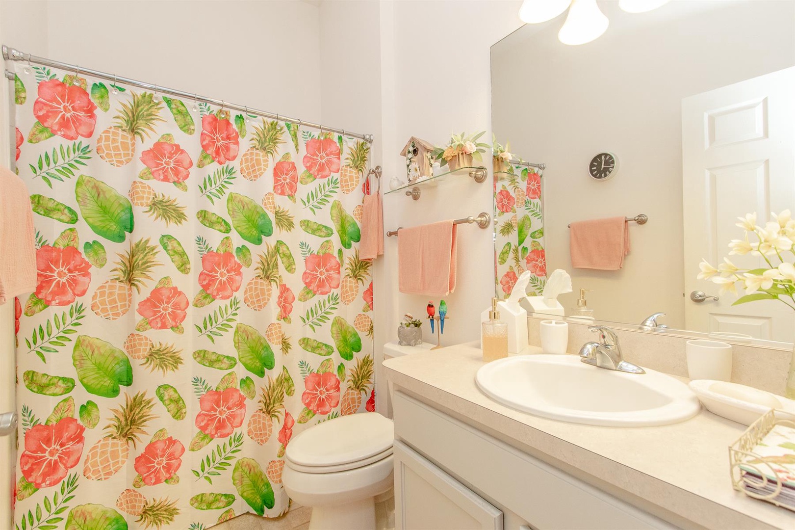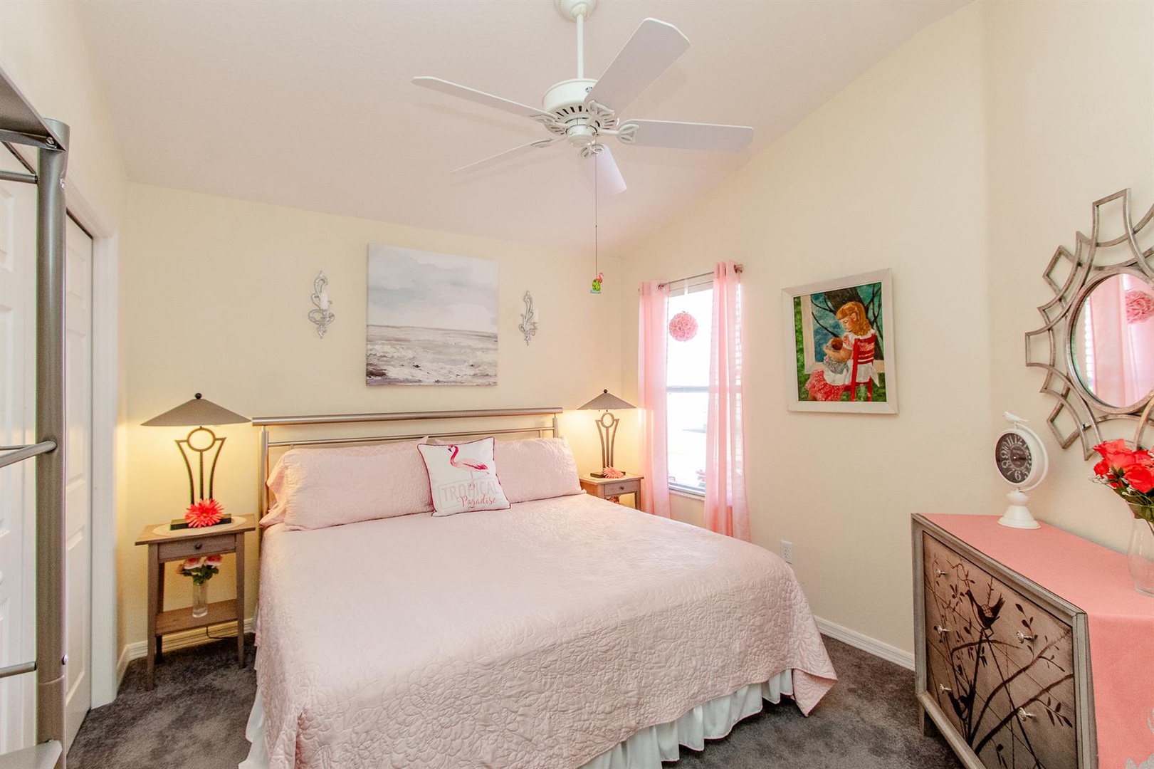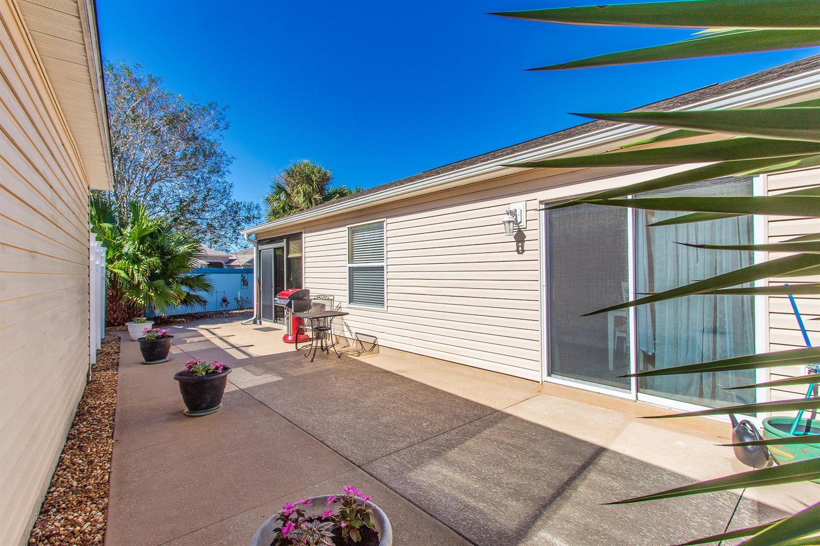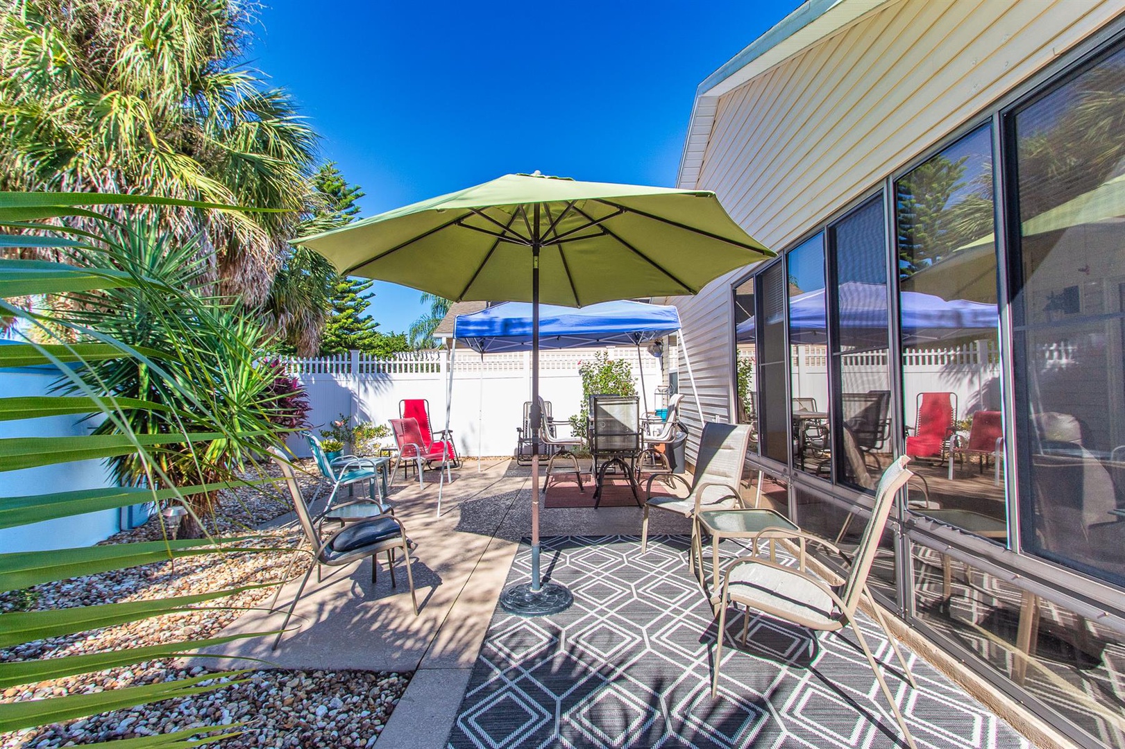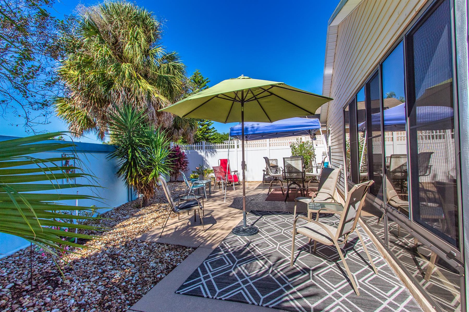 Outside, relish the Florida weather from the various seating options available. The master bedroom boasts a king-size bed and another Smart TV for unwinding in comfort. Its ensuite bathroom is bright and features double sinks and a walk-in shower with sleek glass doors.