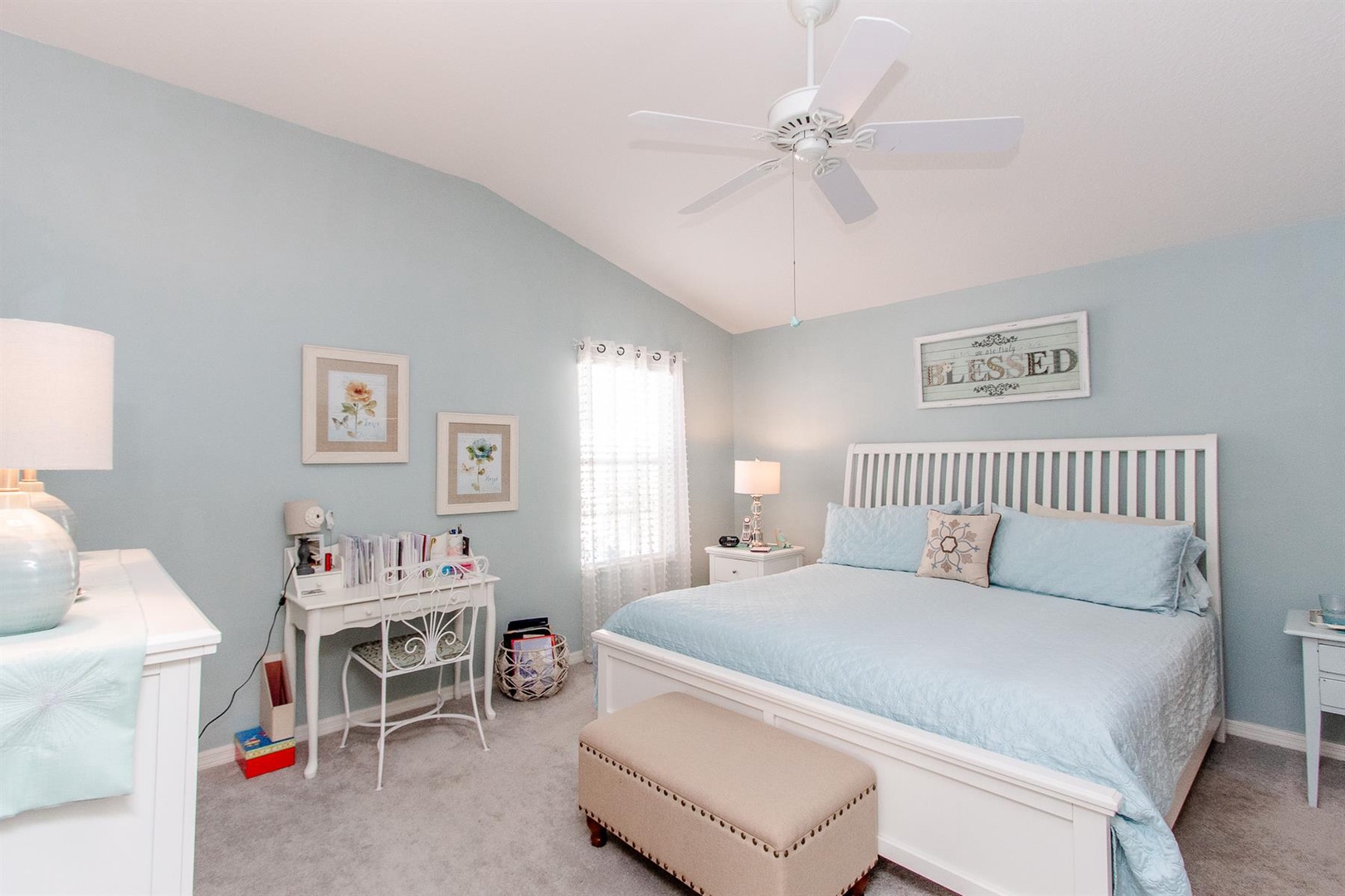 The guest bedroom offers another king-size bed and an ensuite bathroom with a convenient tub/shower combo—perfect for a relaxing soak.