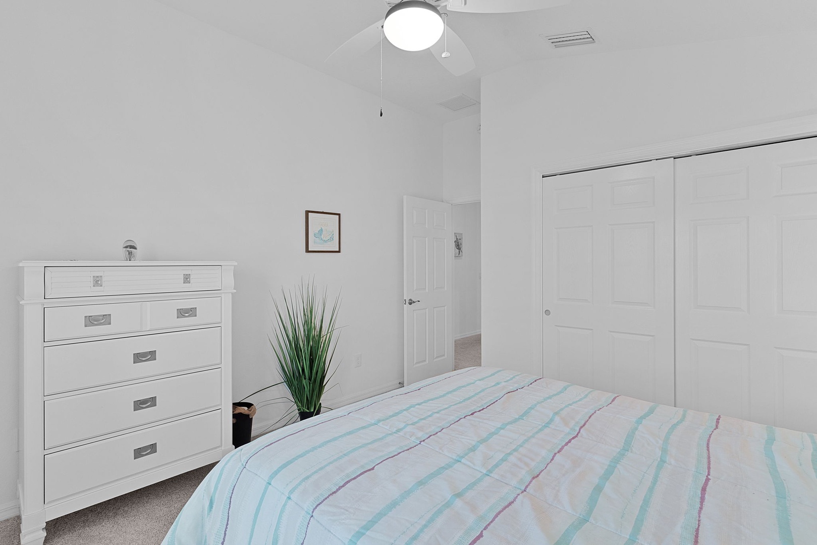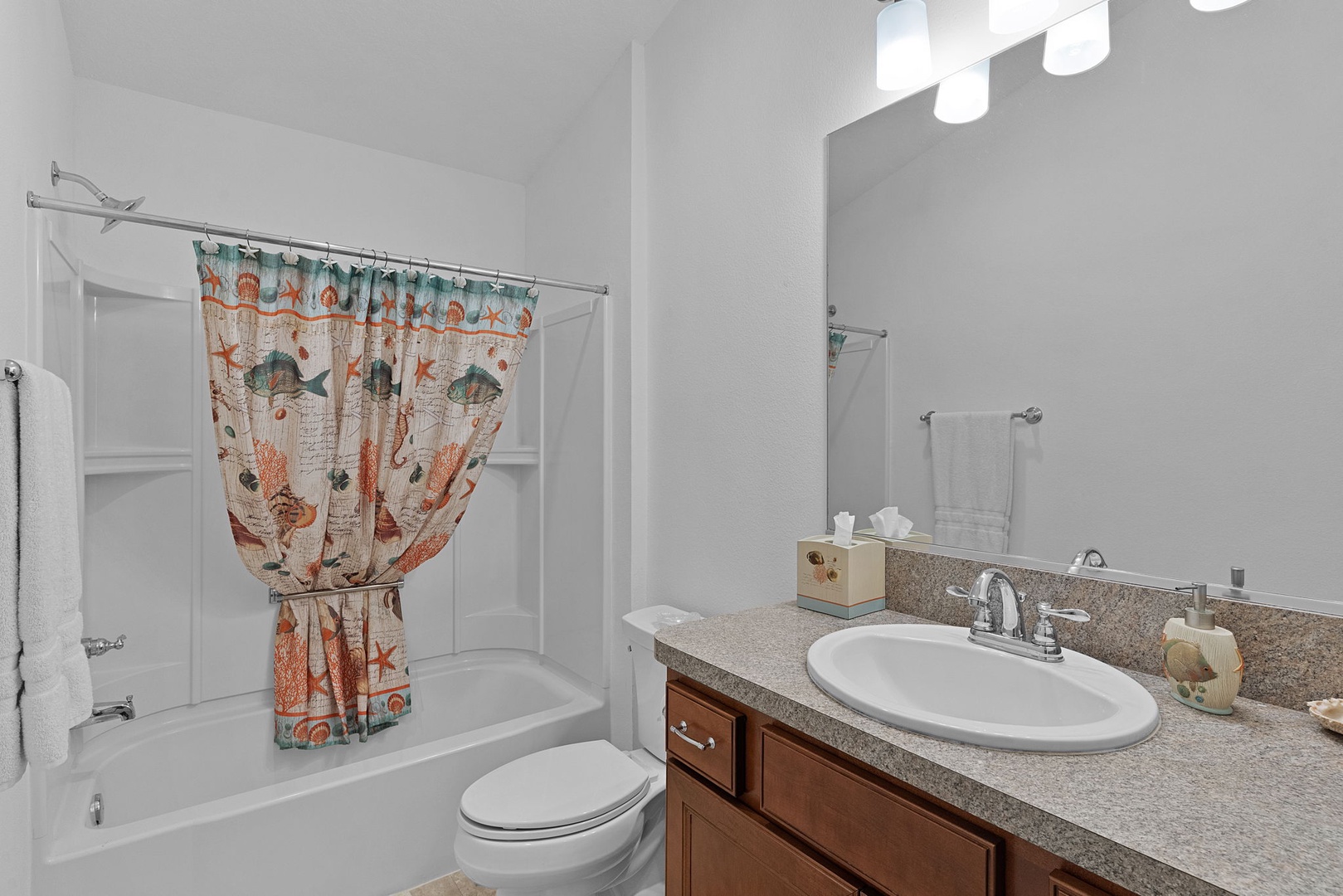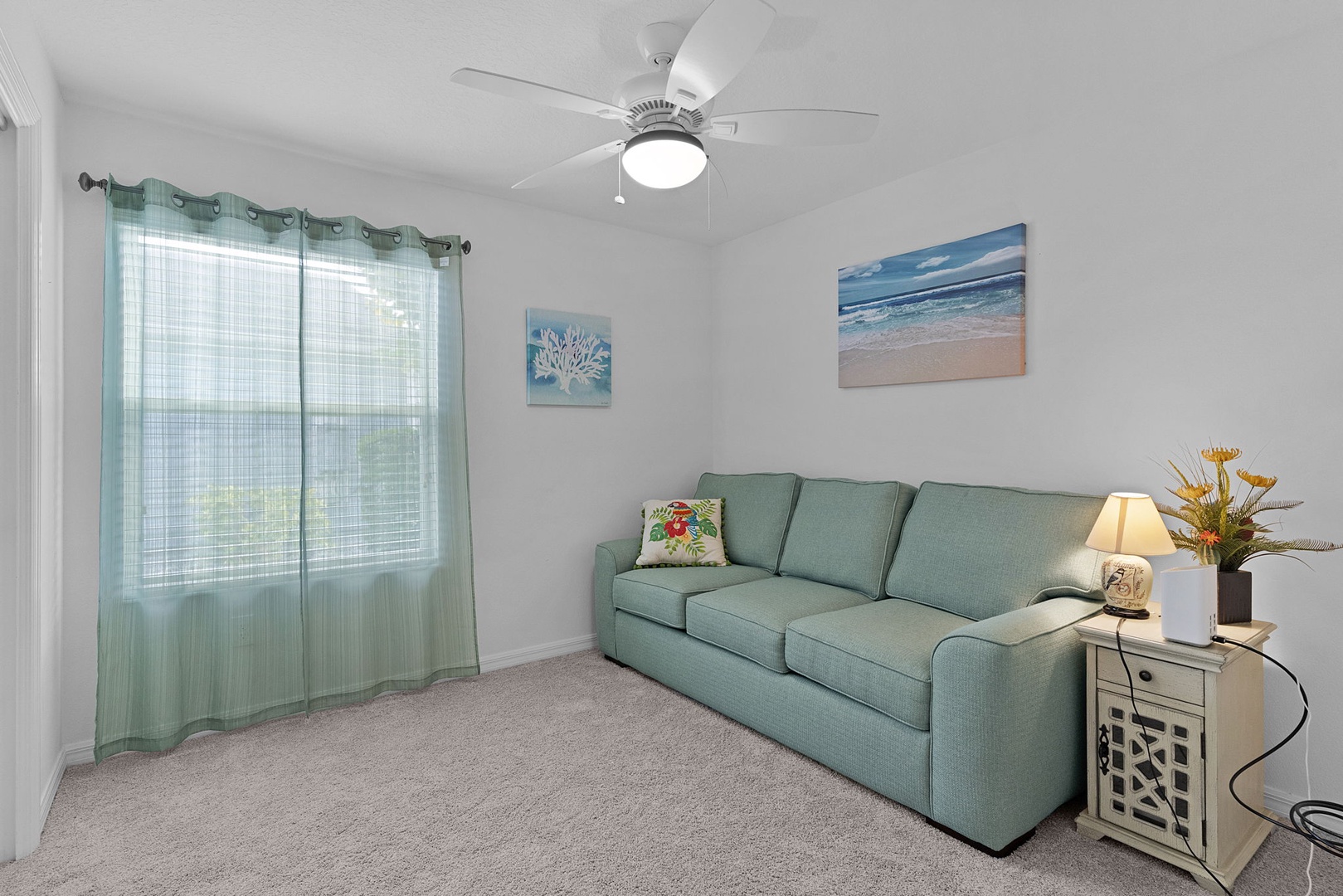 Guest Bedroom One is furnished with a queen-size bed, while Guest Bedroom Two is flexible—ideal as a sitting room or additional sleeping space with a pull-out bed. The guest bathroom includes a tub/shower combination.