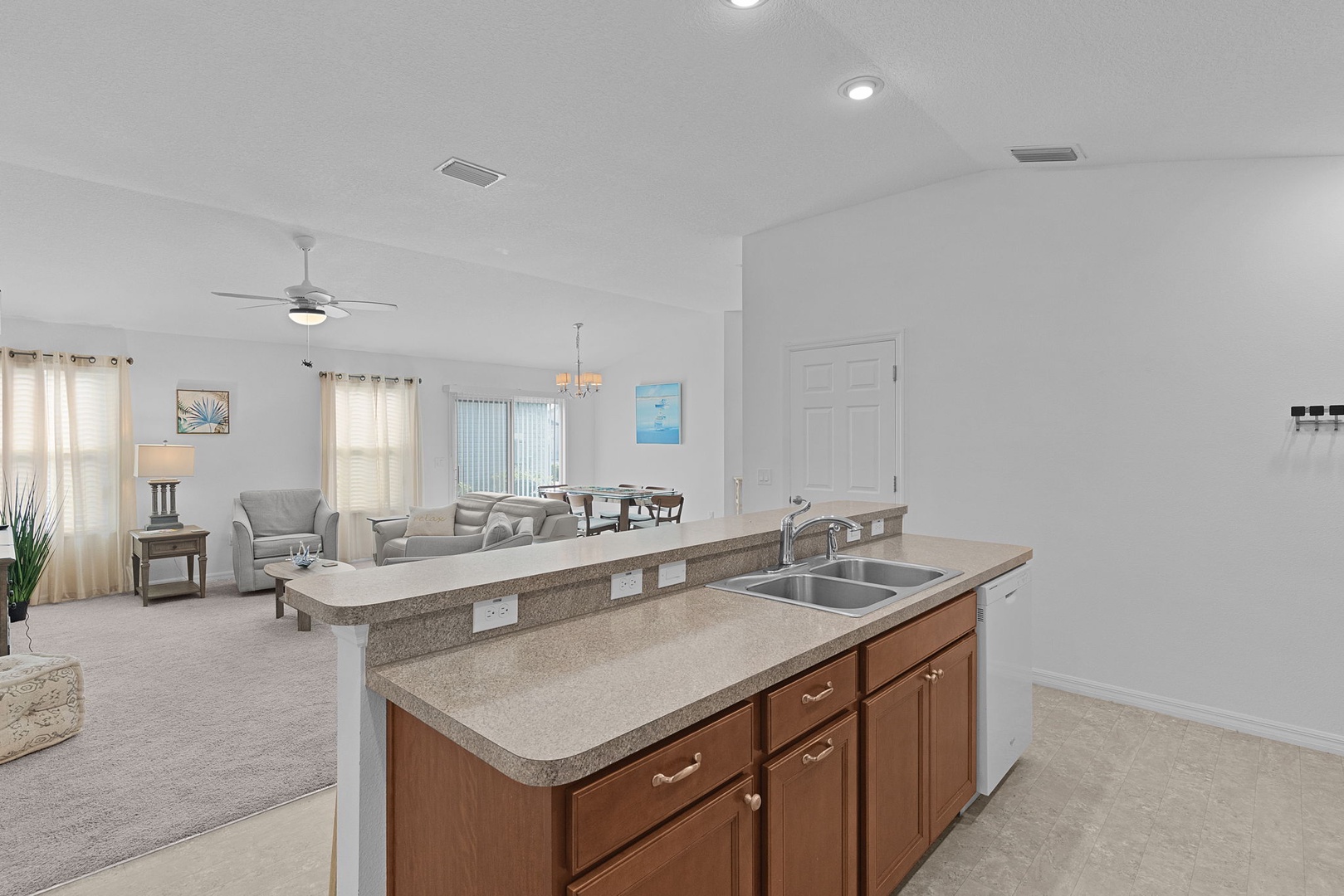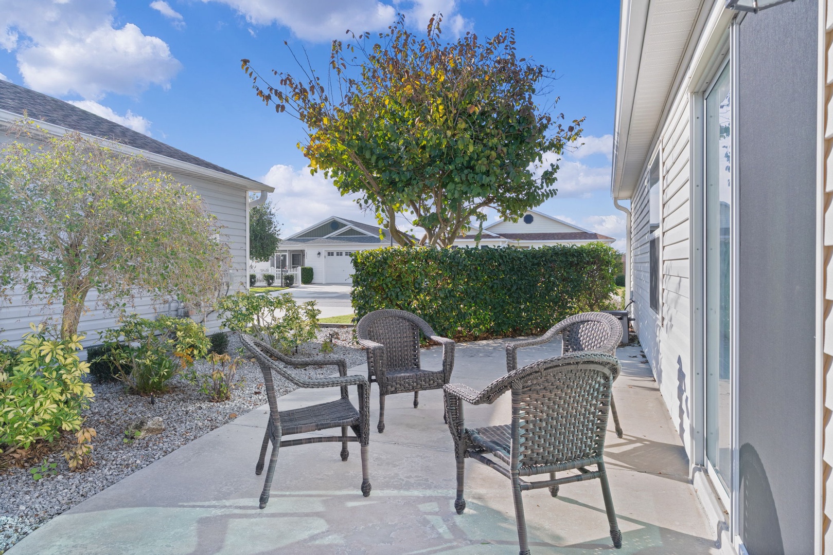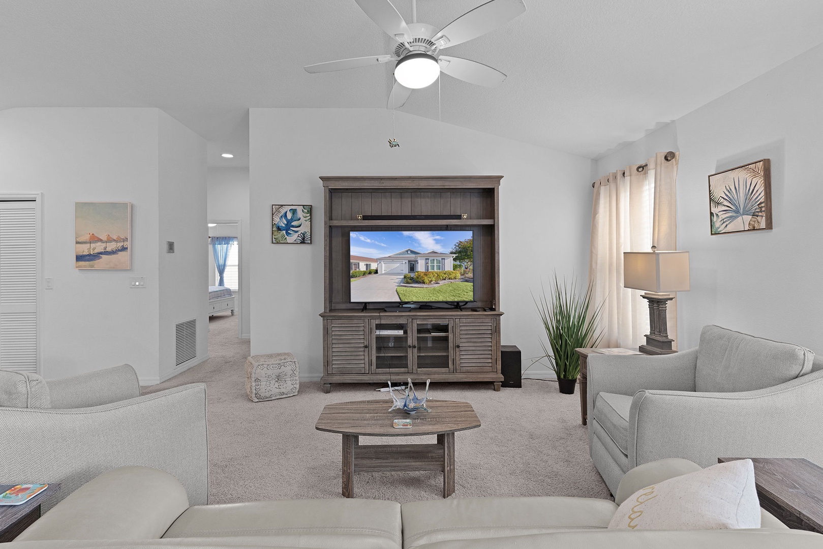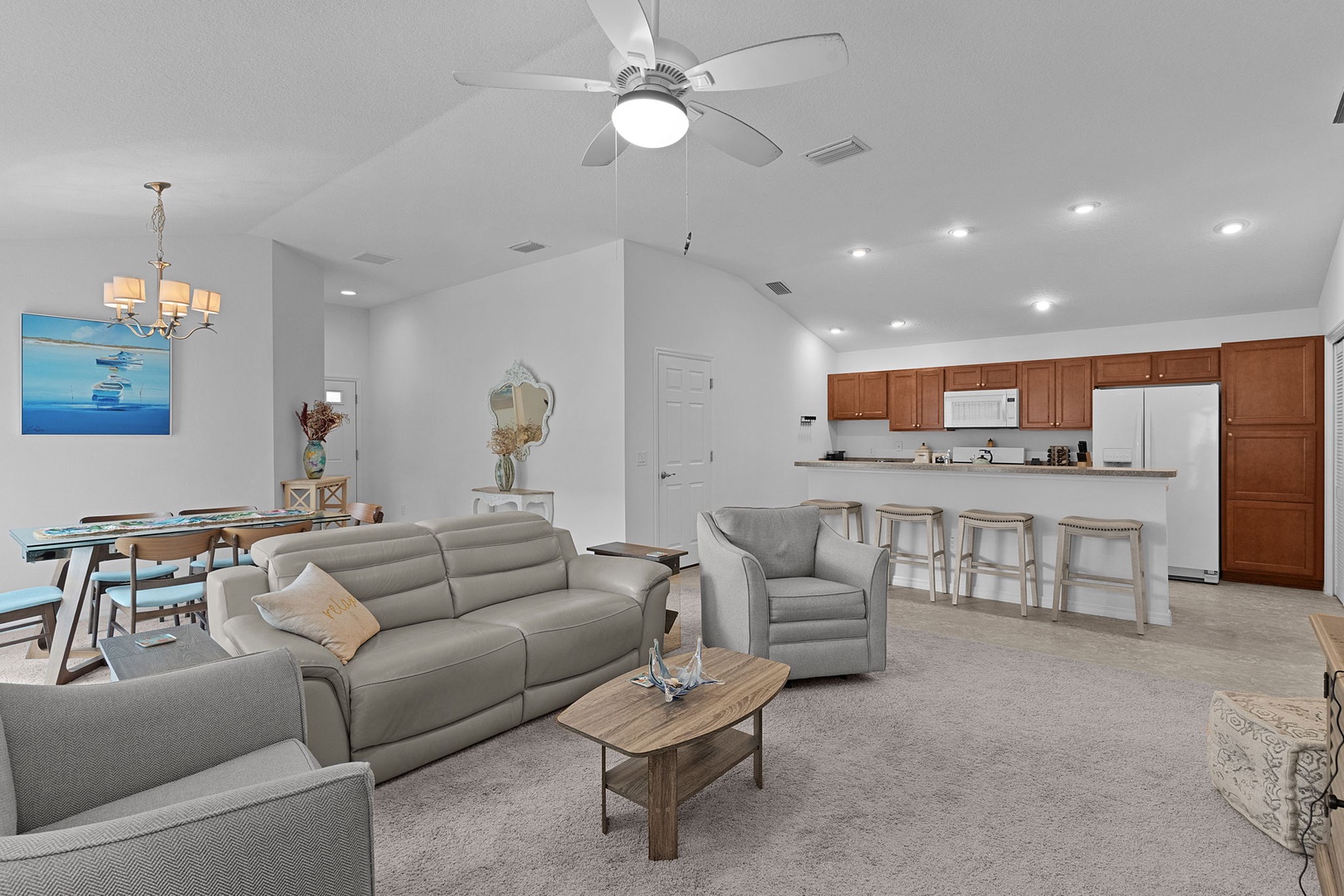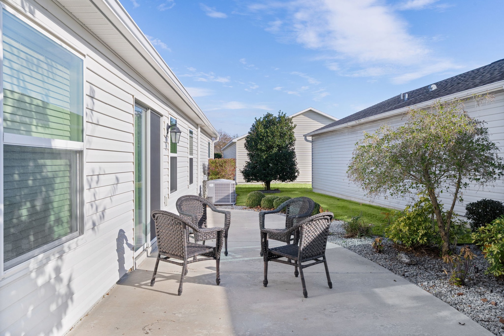 Tile flooring is found in the kitchen and bathrooms, with carpet throughout the remainder of the home for added comfort. The golf cart garage accommodates a rented golf cart, and outside you’ll enjoy cooking and entertaining on the brand-new Blackstone grill—perfect for enjoying Florida living at its best.