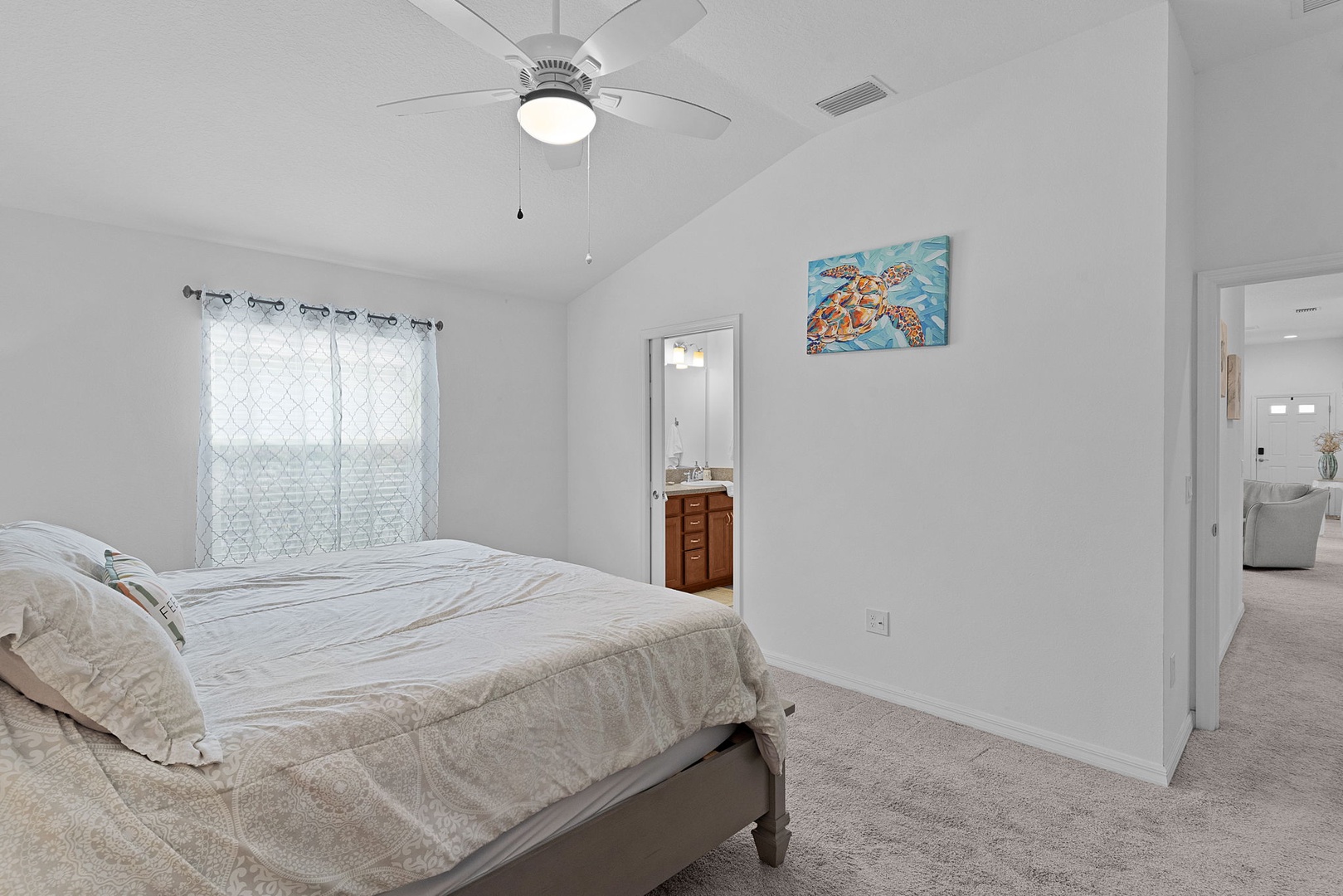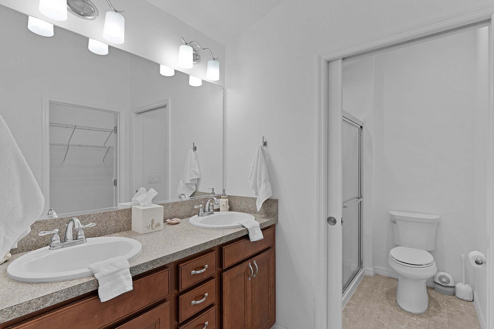 The comfortable living room offers a couch and two rocker chairs, creating a perfect space to relax after a day of exploring. The primary suite includes a king-size bed, walk-in closet, and a private bath with dual sinks and a walk-in shower.