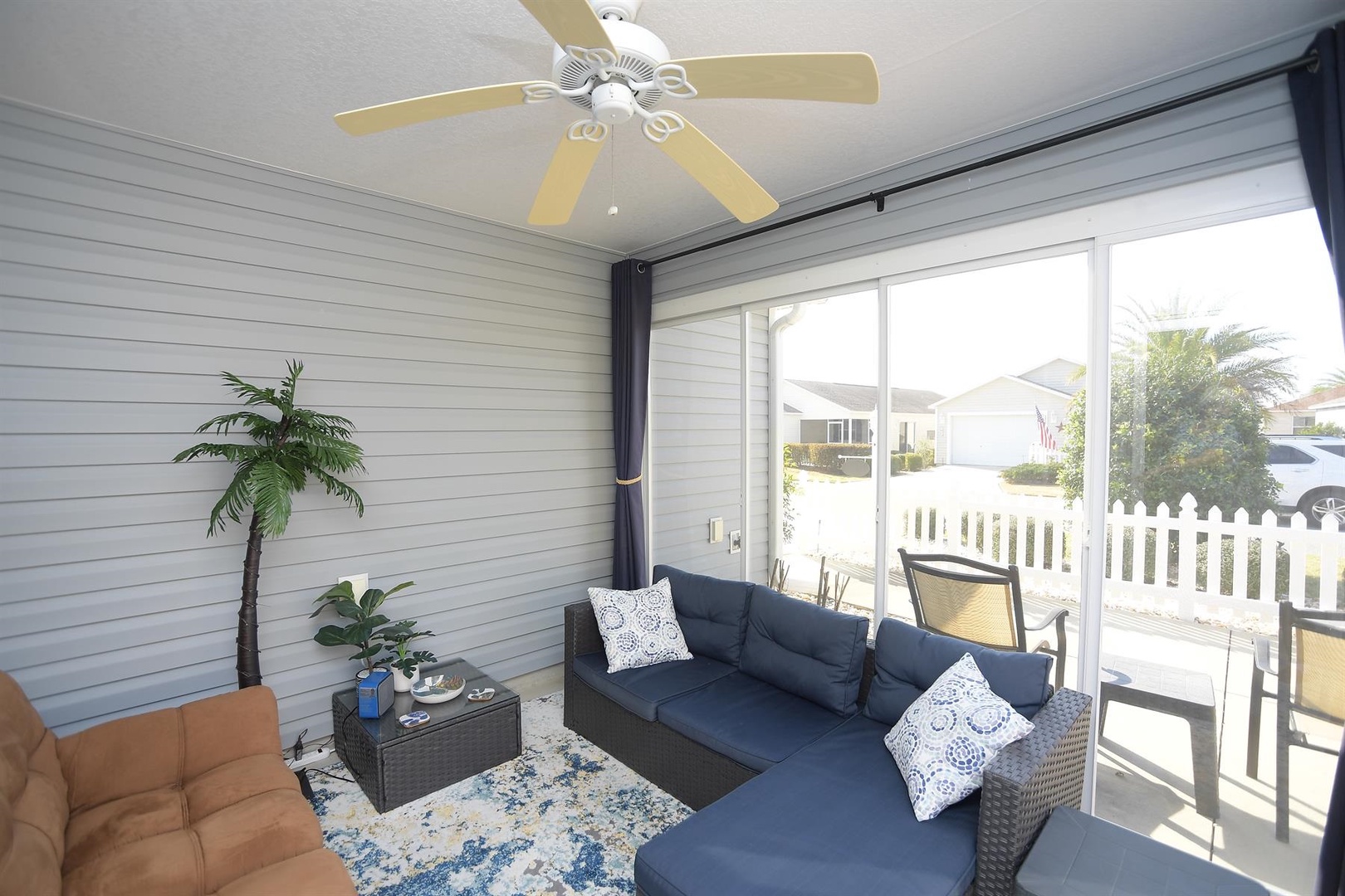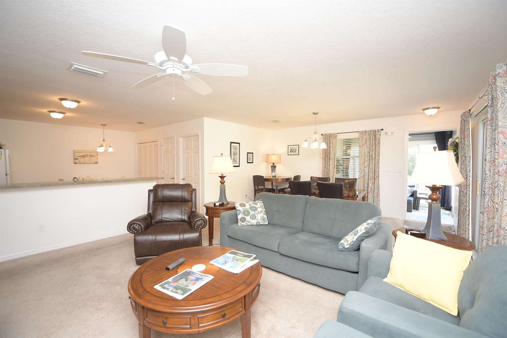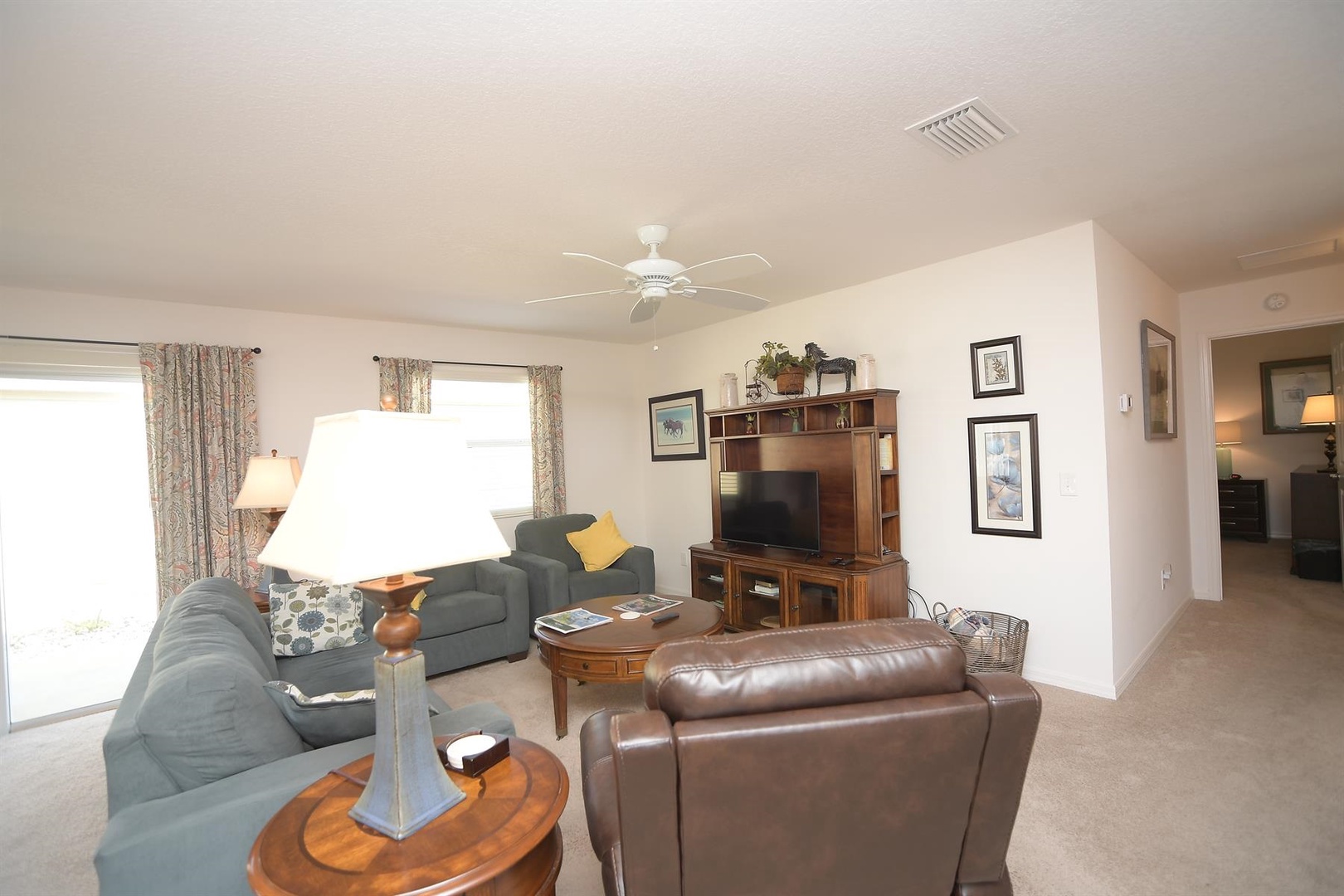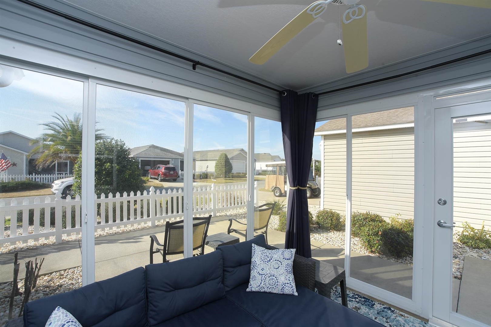 Enjoy breakfast at the quaint kitchen dining table, then entertain guests in the elegant dining room with seating for up to six. Unwind in the cozy living room, featuring a comfortable sofa, recliner, and two single chairs—ideal for relaxing after a full day of Villages activities.