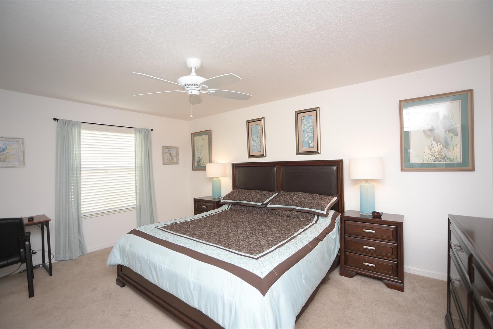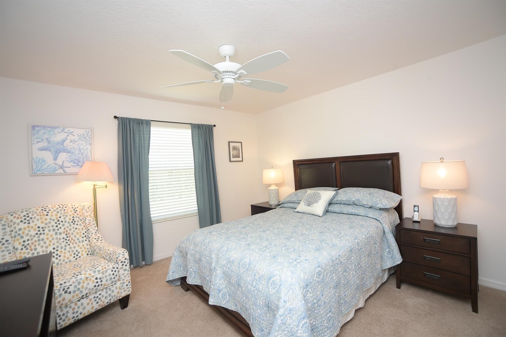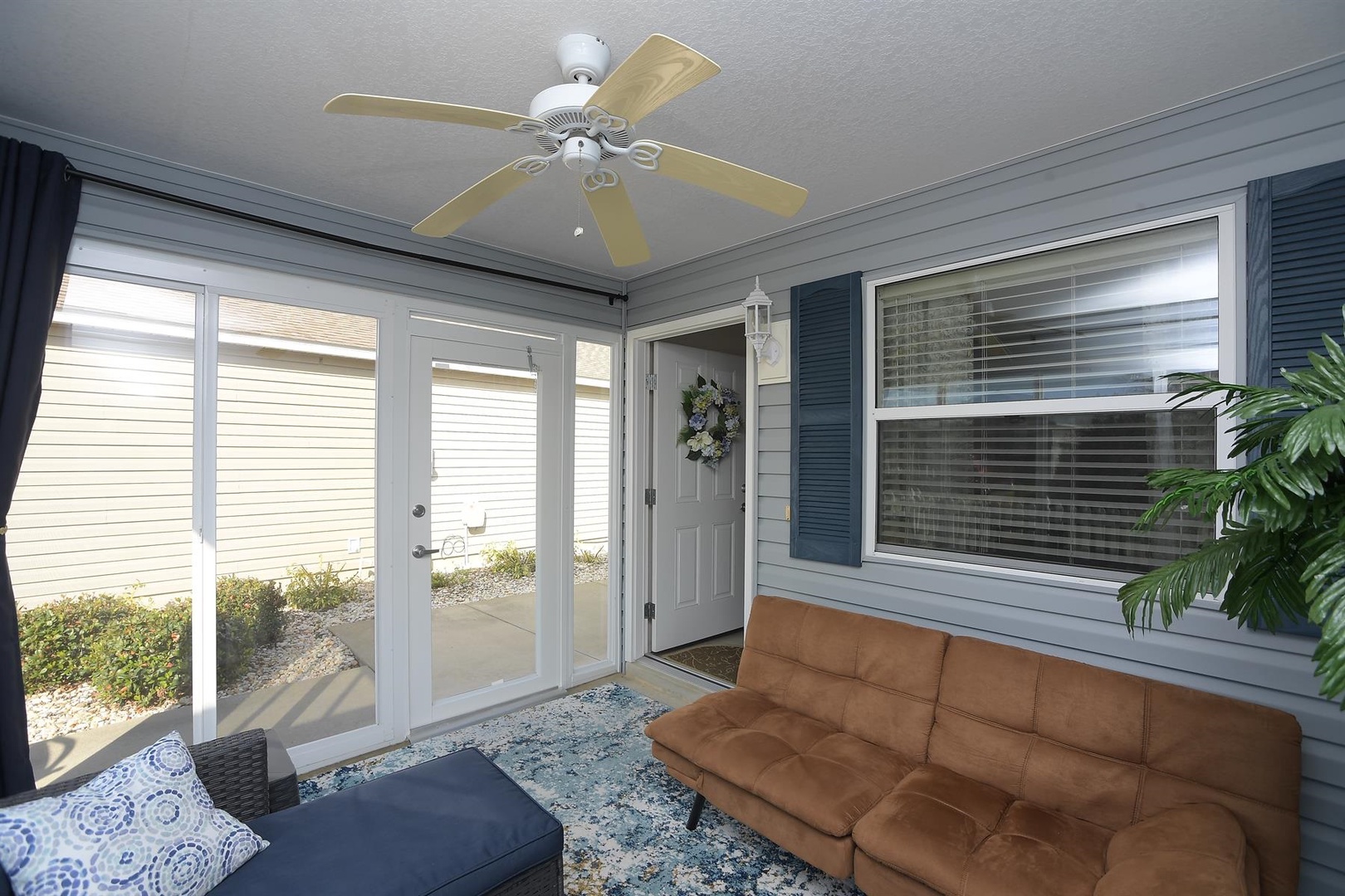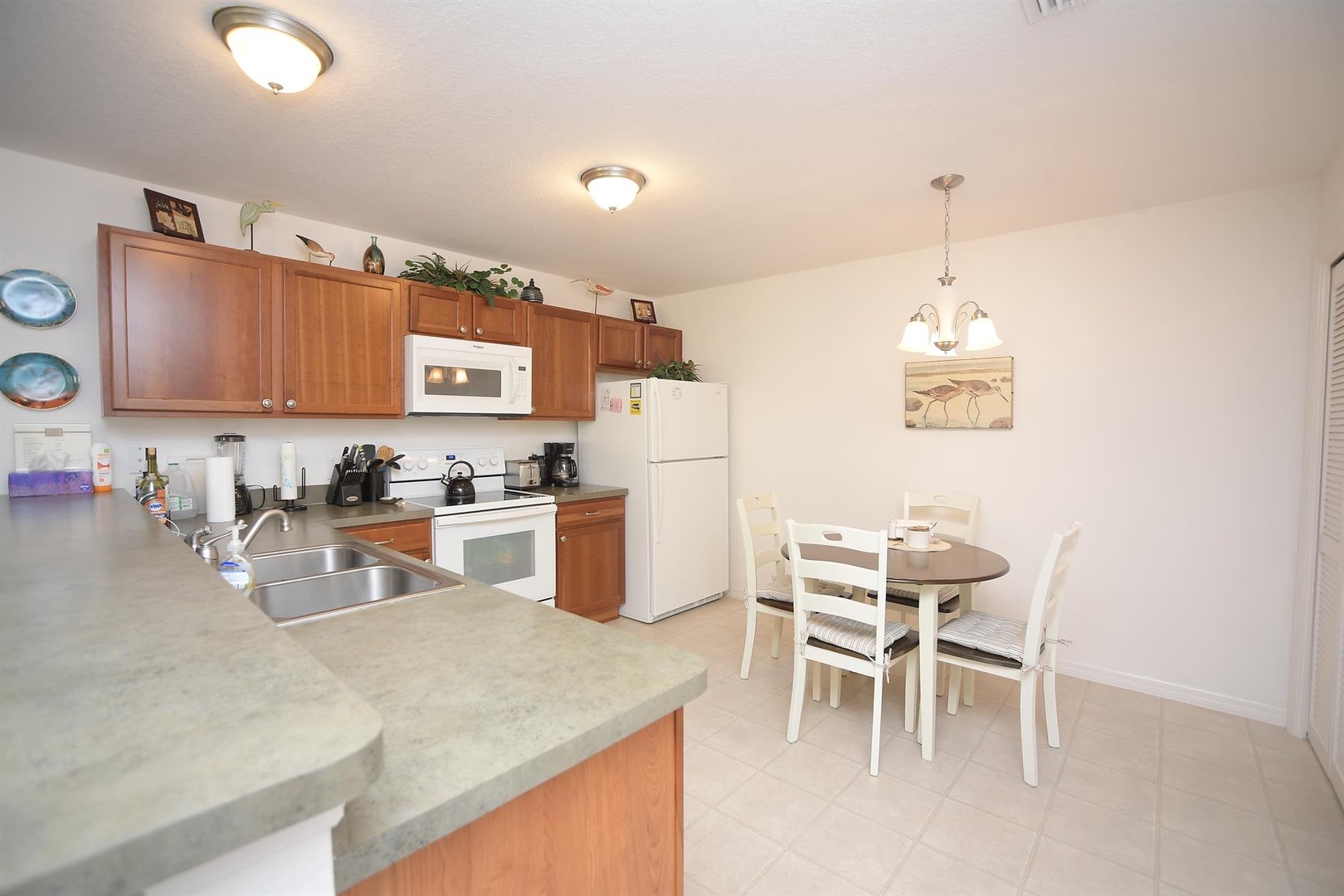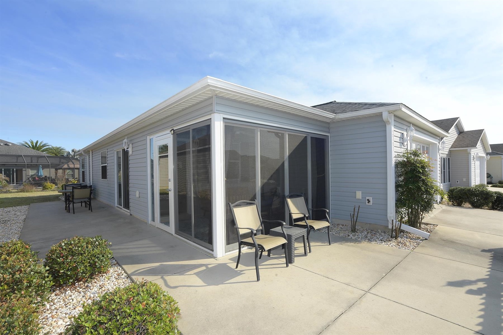 Enjoy breakfast at the quaint kitchen dining table, then entertain guests in the elegant dining room with seating for up to six. Unwind in the cozy living room, featuring a comfortable sofa, recliner, and two single chairs—ideal for relaxing after a full day of Villages activities.