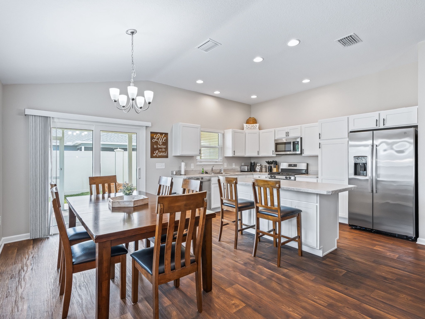 Welcome to Your Perfect Getaway! This bright and inviting home features an open living room with a couch, loveseat, and oversized recliner, plus a modern kitchen with stainless steel appliances and a large SMART TV and fast internet. The master suite offers a king bed, SMART TV, and a spacious bath with dual sinks and walk-in shower, while both guest bedrooms have queen beds. Enjoy the screened lanai with ample seating, a private fenced backyard, and the convenience of a 4-seater golf cart (back seats flip down with seat belts). Perfectly located just minutes from shopping, dining, and fun, and only a short drive to Eastport—the newest addition to The Villages!