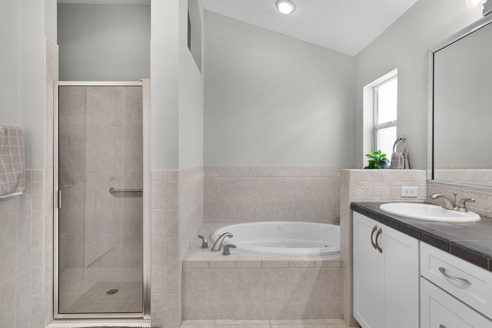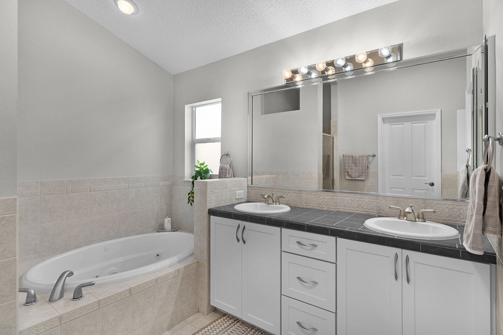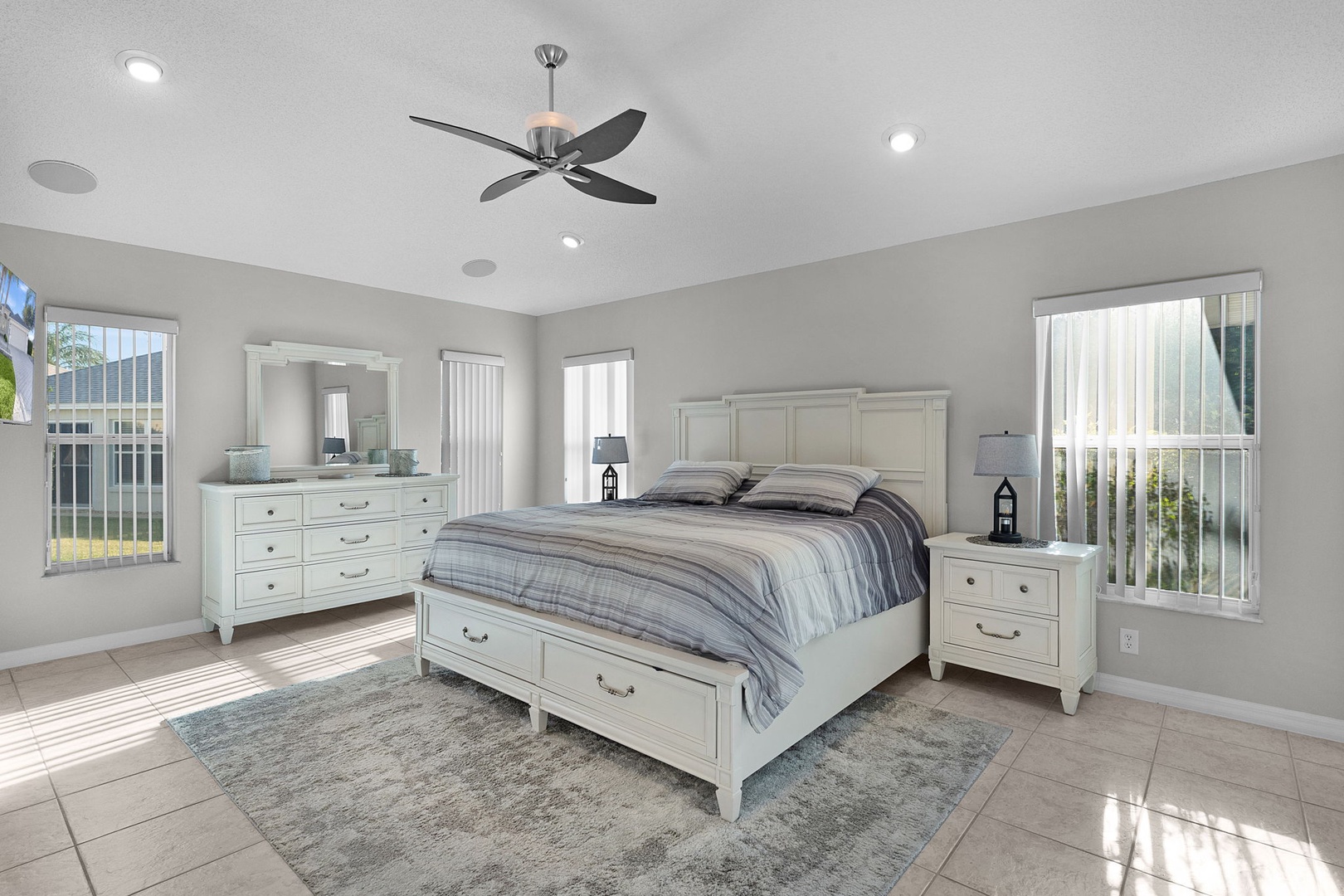 Retreat to the large master bedroom featuring a plush king-size bed and another Smart TV for ultimate relaxation. Indulge yourself in the luxurious master bath, showcasing a jetted tub, walk-in shower, double sinks, and even a private toilet room.