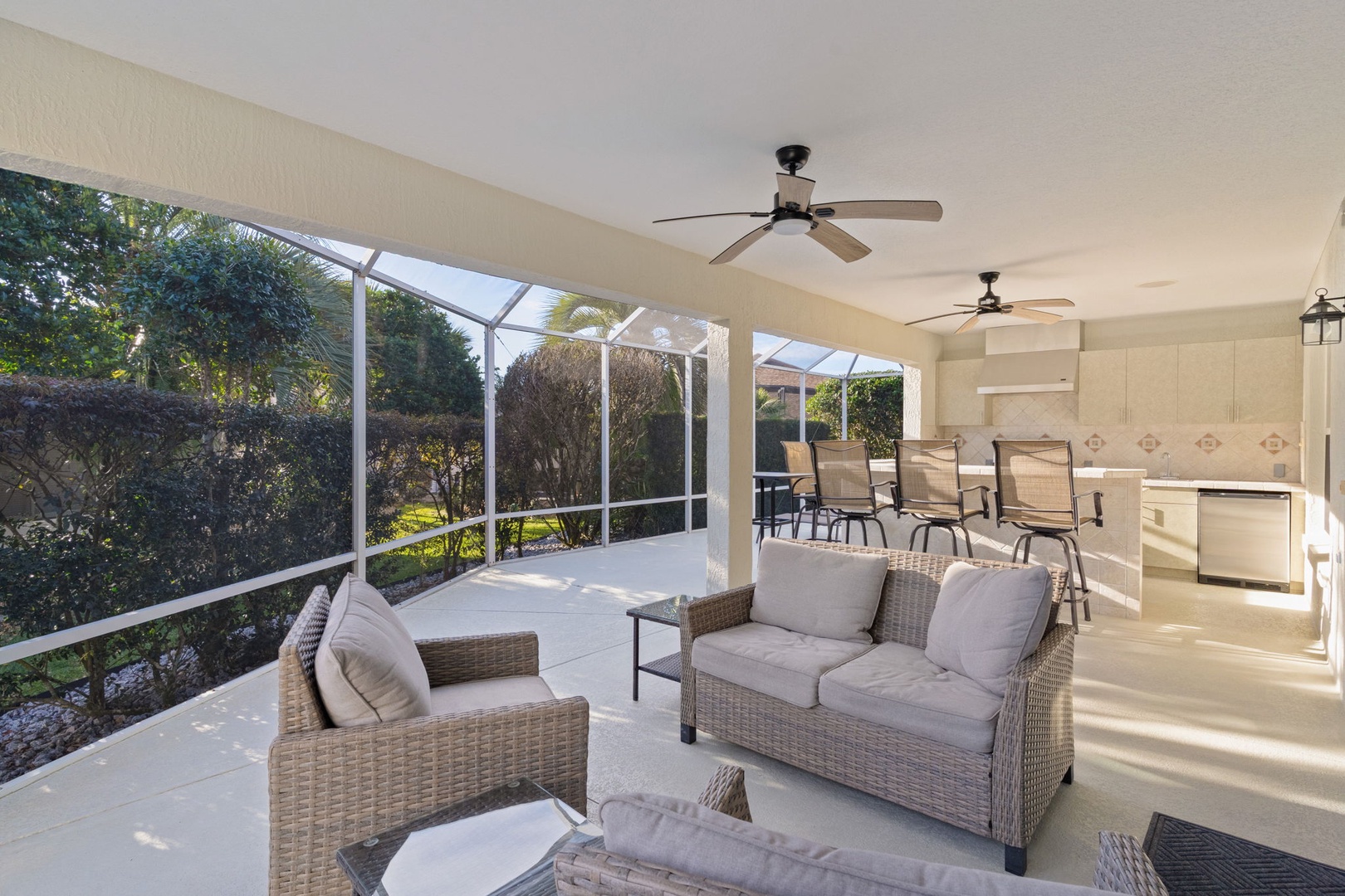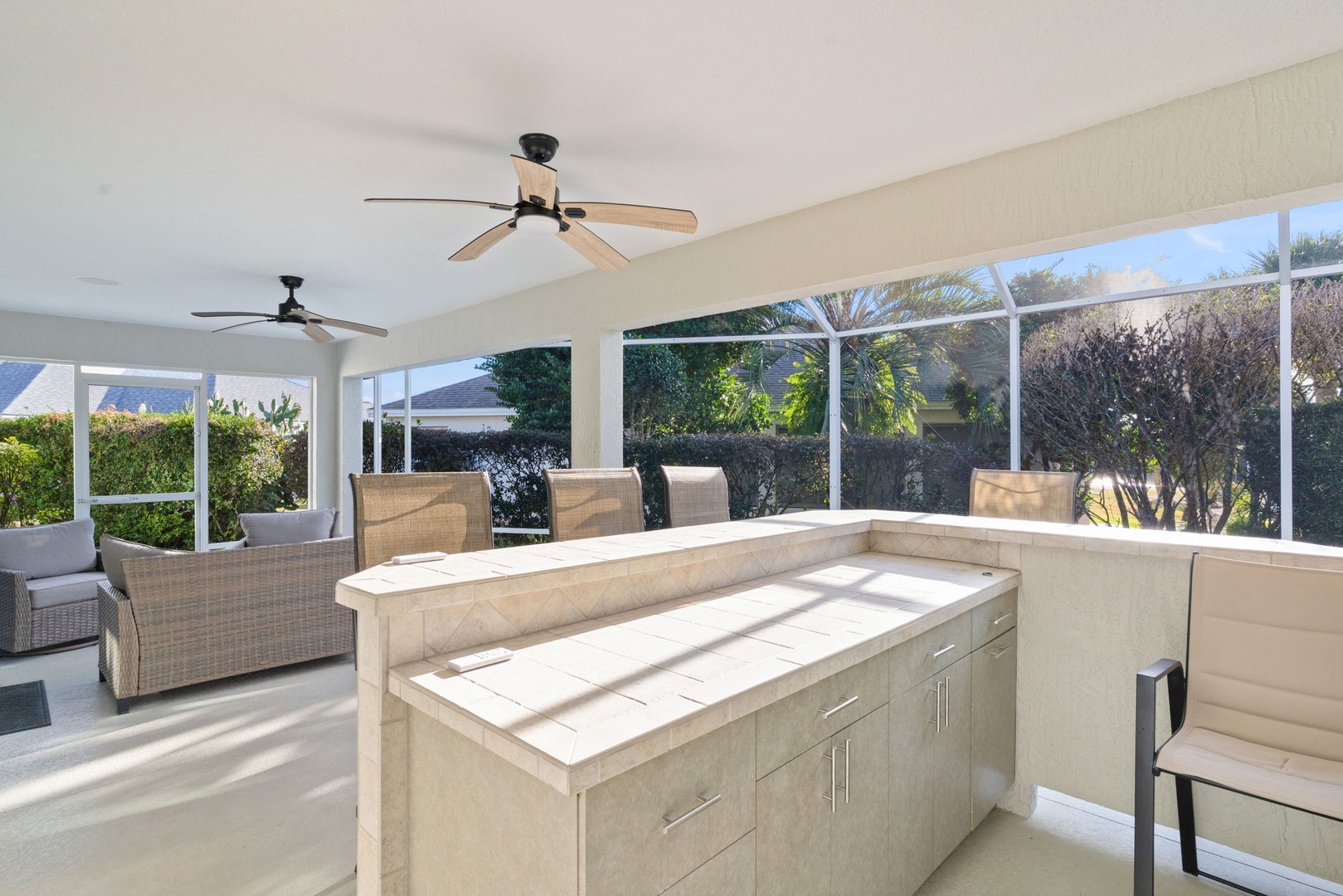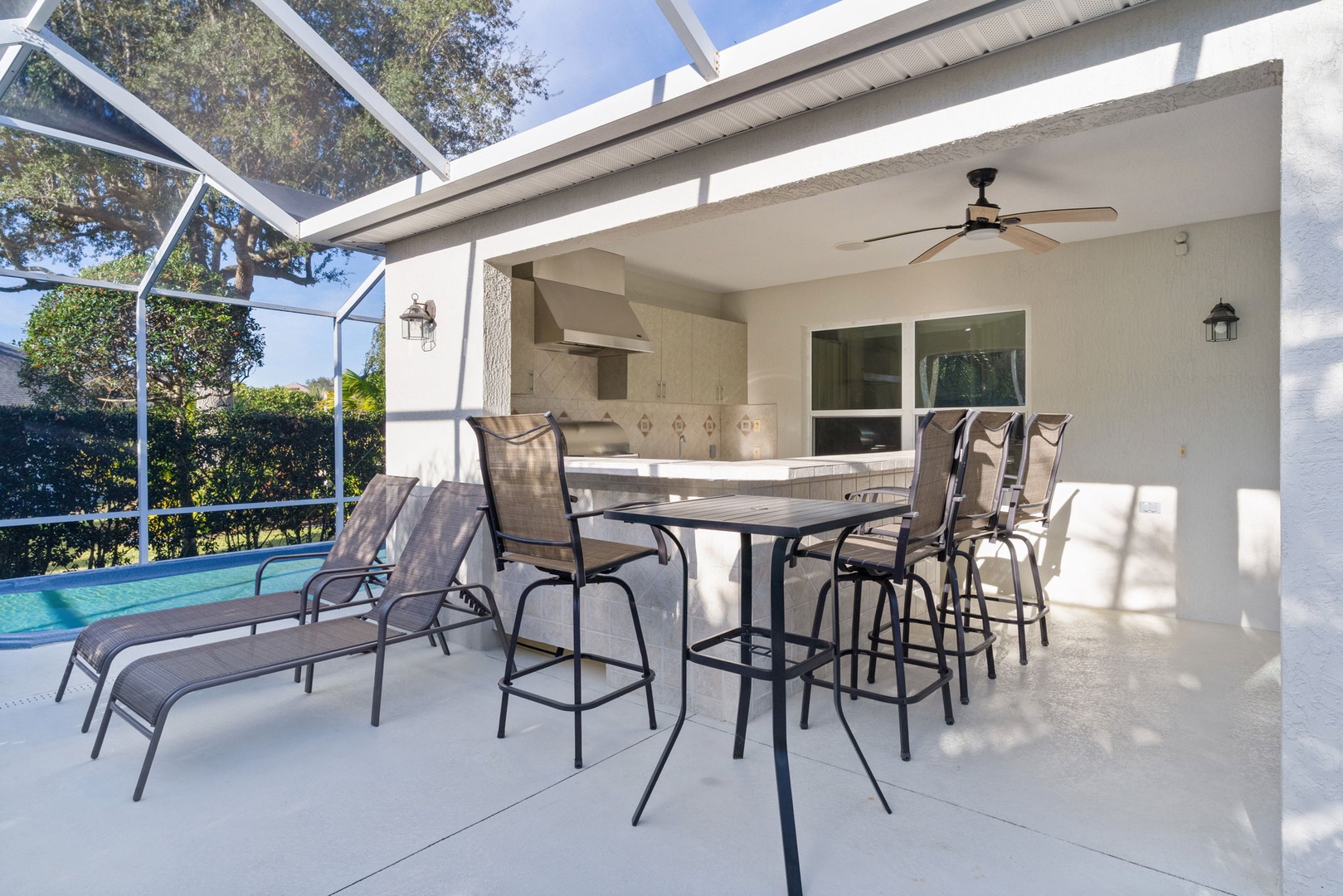 Step outside onto the expansive lanai that beckons you to unwind amidst its serene ambiance. Seating around the bar area provides ample space for socializing. Immerse yourself in pure bliss as you soak in the sparkling swim spa. The beautifully landscaped backyard offers privacy and tranquility, making it the perfect oasis for enjoying the Florida sunshine.