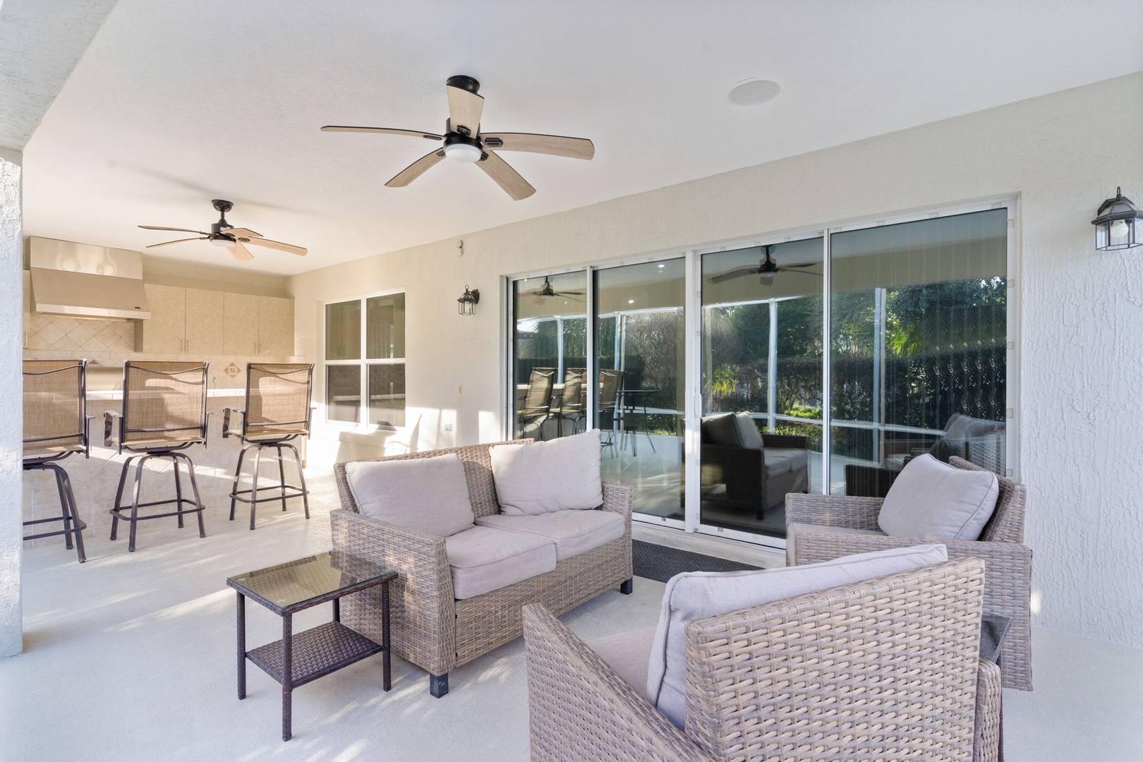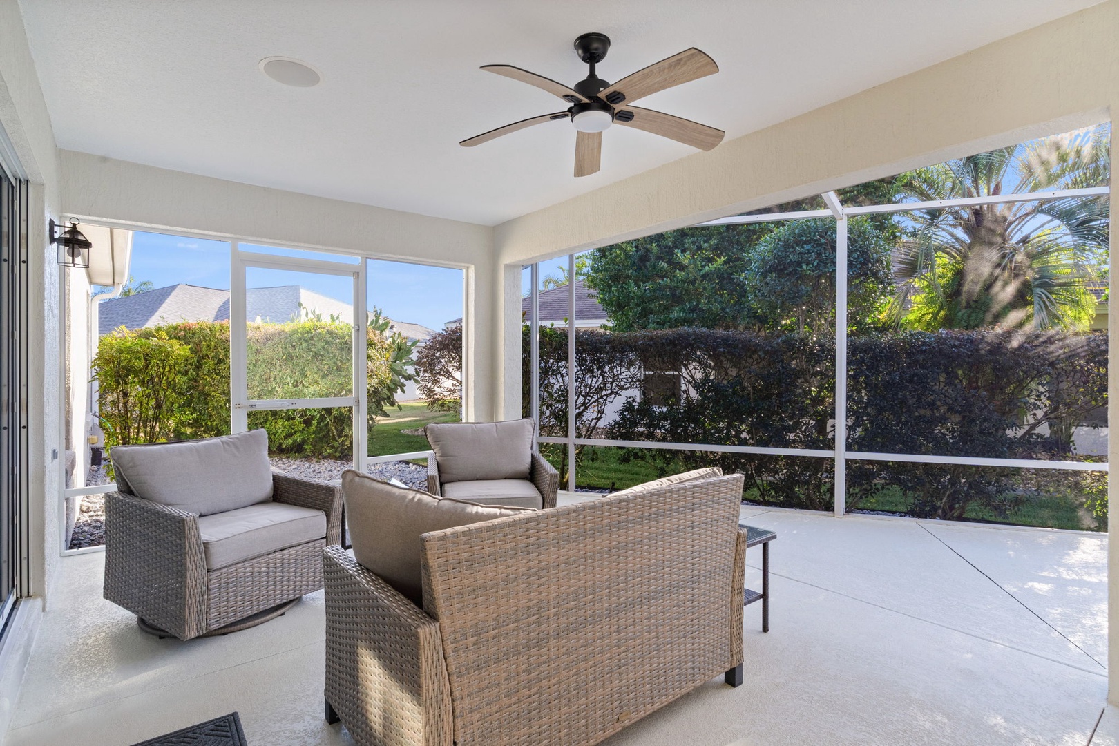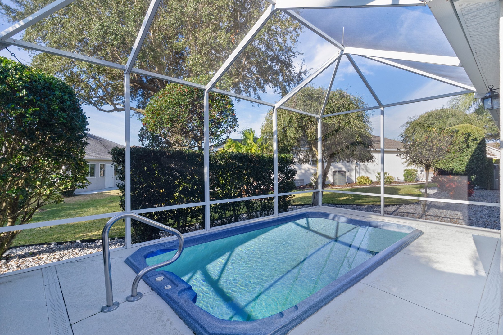 Step outside onto the expansive lanai that beckons you to unwind amidst its serene ambiance. Seating around the bar area provides ample space for socializing. Immerse yourself in pure bliss as you soak in the sparkling swim spa. The beautifully landscaped backyard offers privacy and tranquility, making it the perfect oasis for enjoying the Florida sunshine.