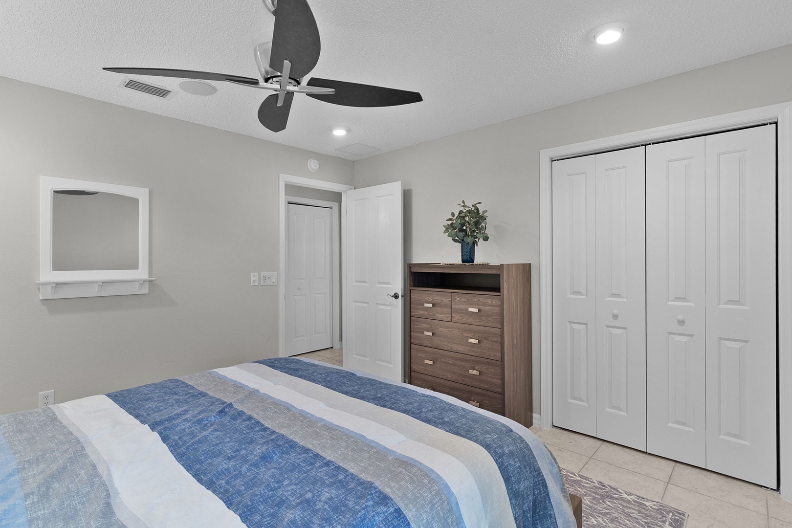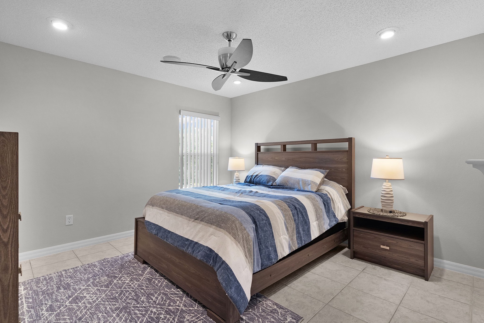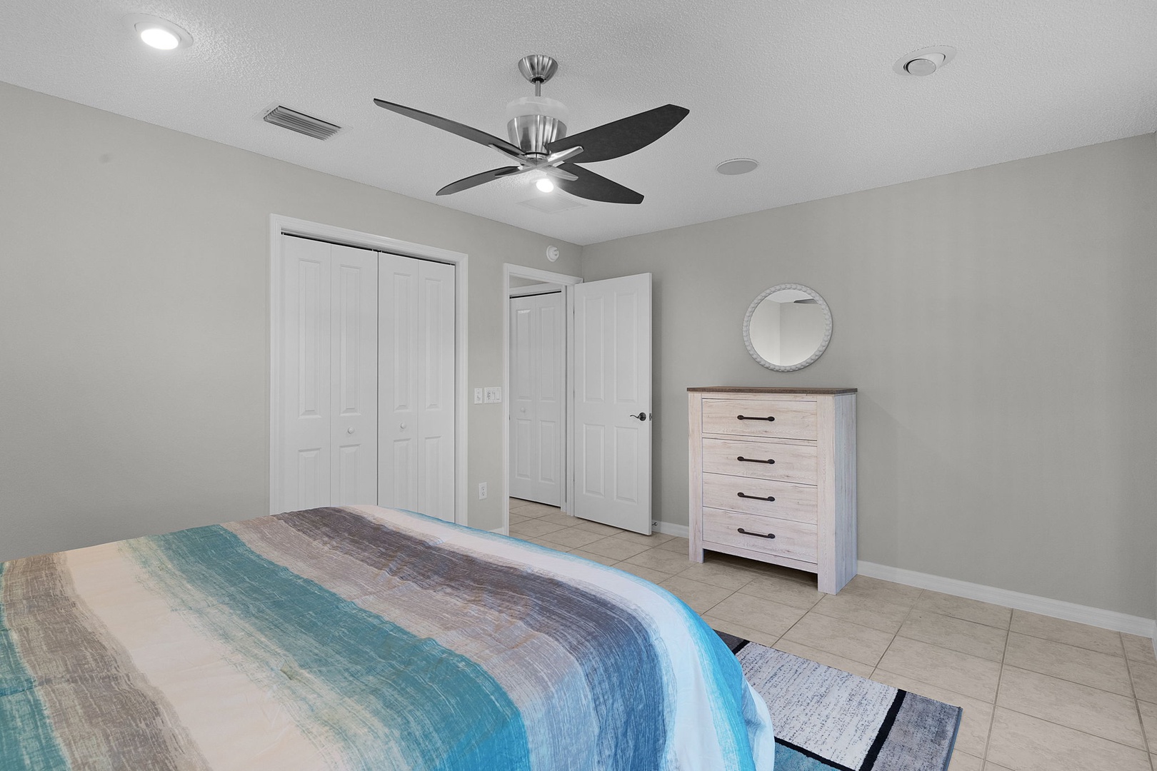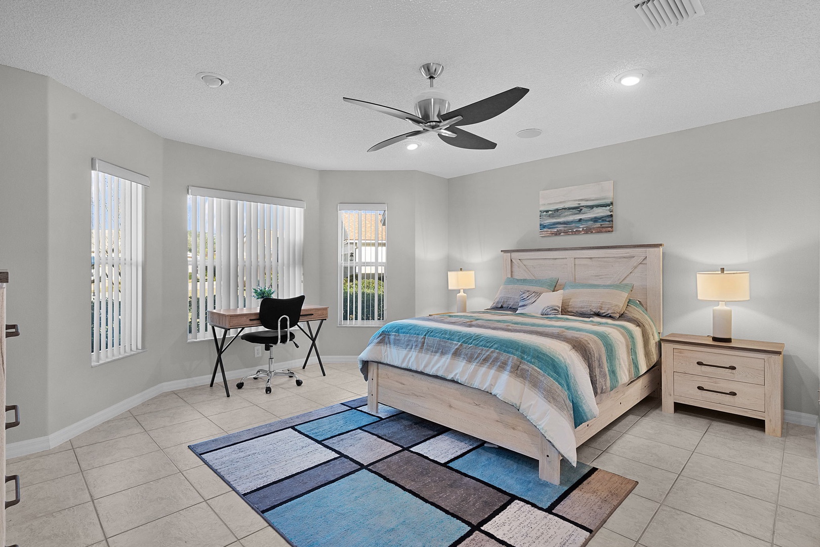 Both guest bedrooms offer queen-size beds for added comfort and convenience. The guest bathroom boasts an inviting walk-in bathtub with shower option.