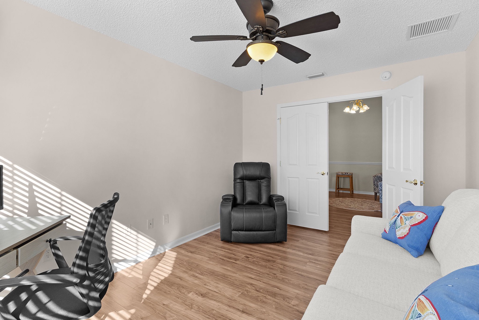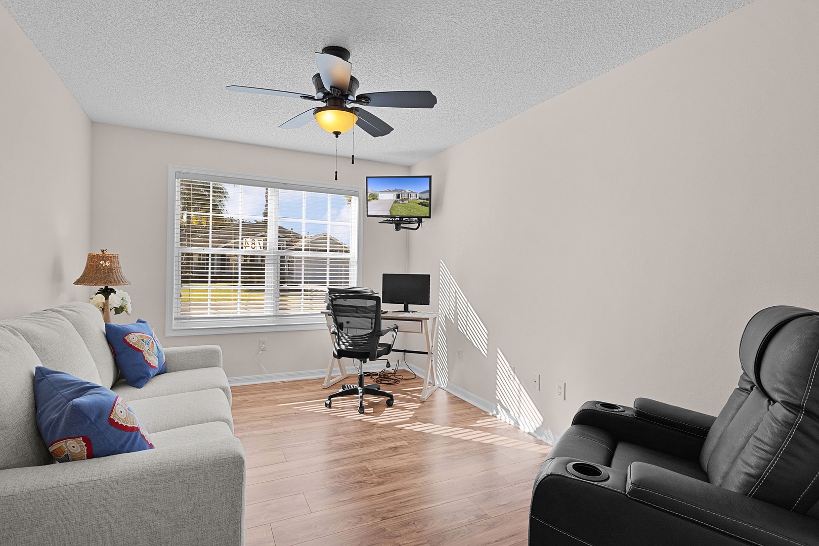 A third bedroom doubles as an office or guest space, featuring a pull-out sofa, TV, desk, and printer—ideal for remote work or visiting guests.