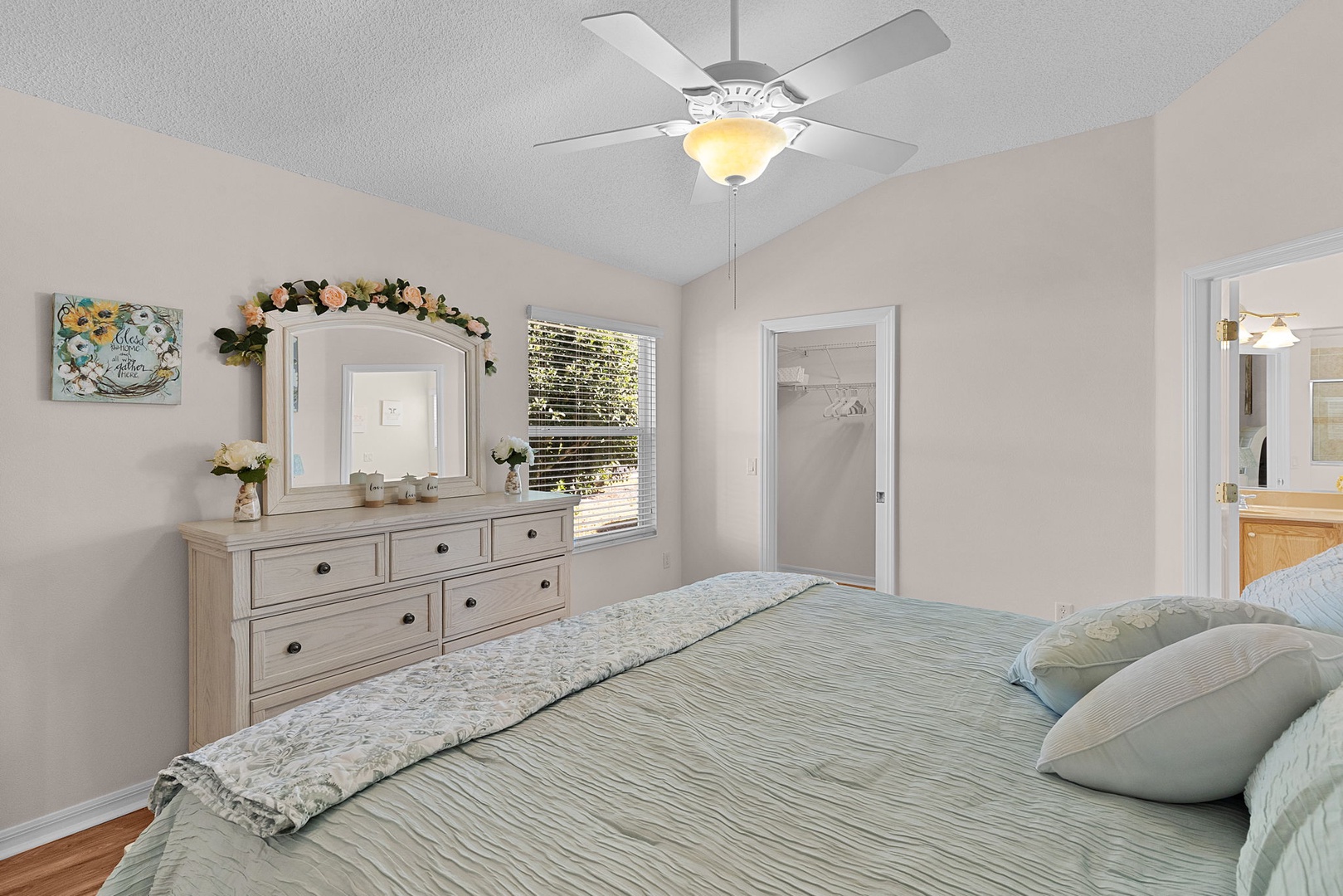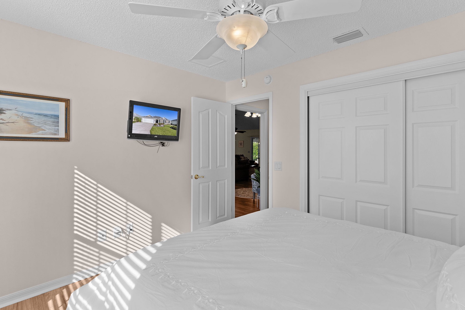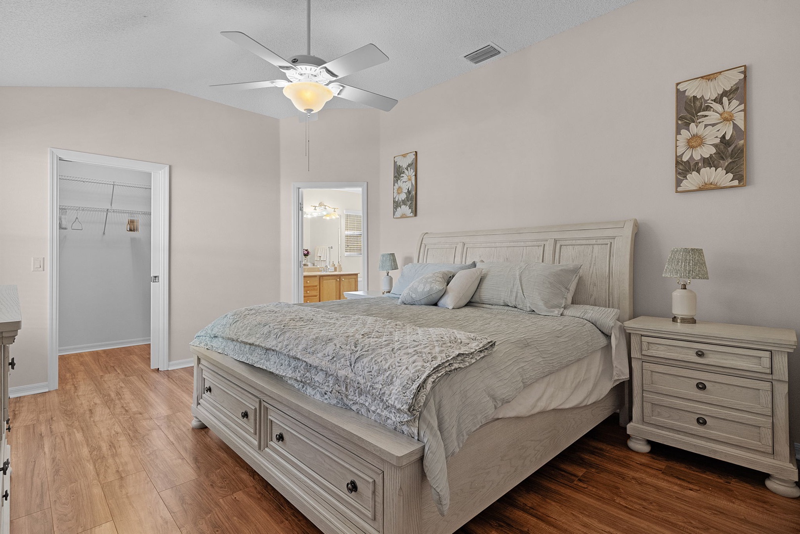 The spacious primary suite includes a king-size bed, walk-in closet, and a private ensuite bathroom with a walk-in shower and dual sinks. The guest bedroom is furnished with a queen-size bed and TV, while the guest bathroom includes a convenient tub/shower combination.