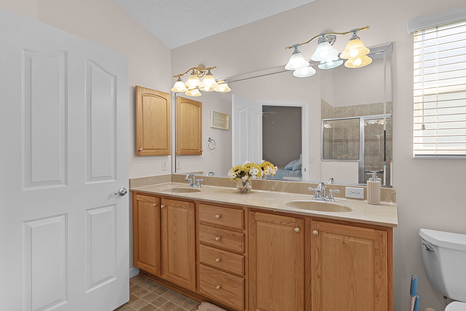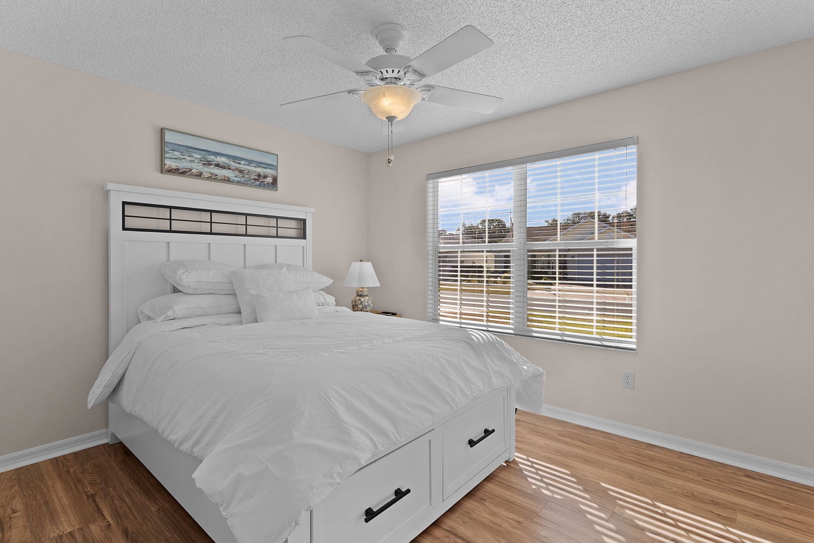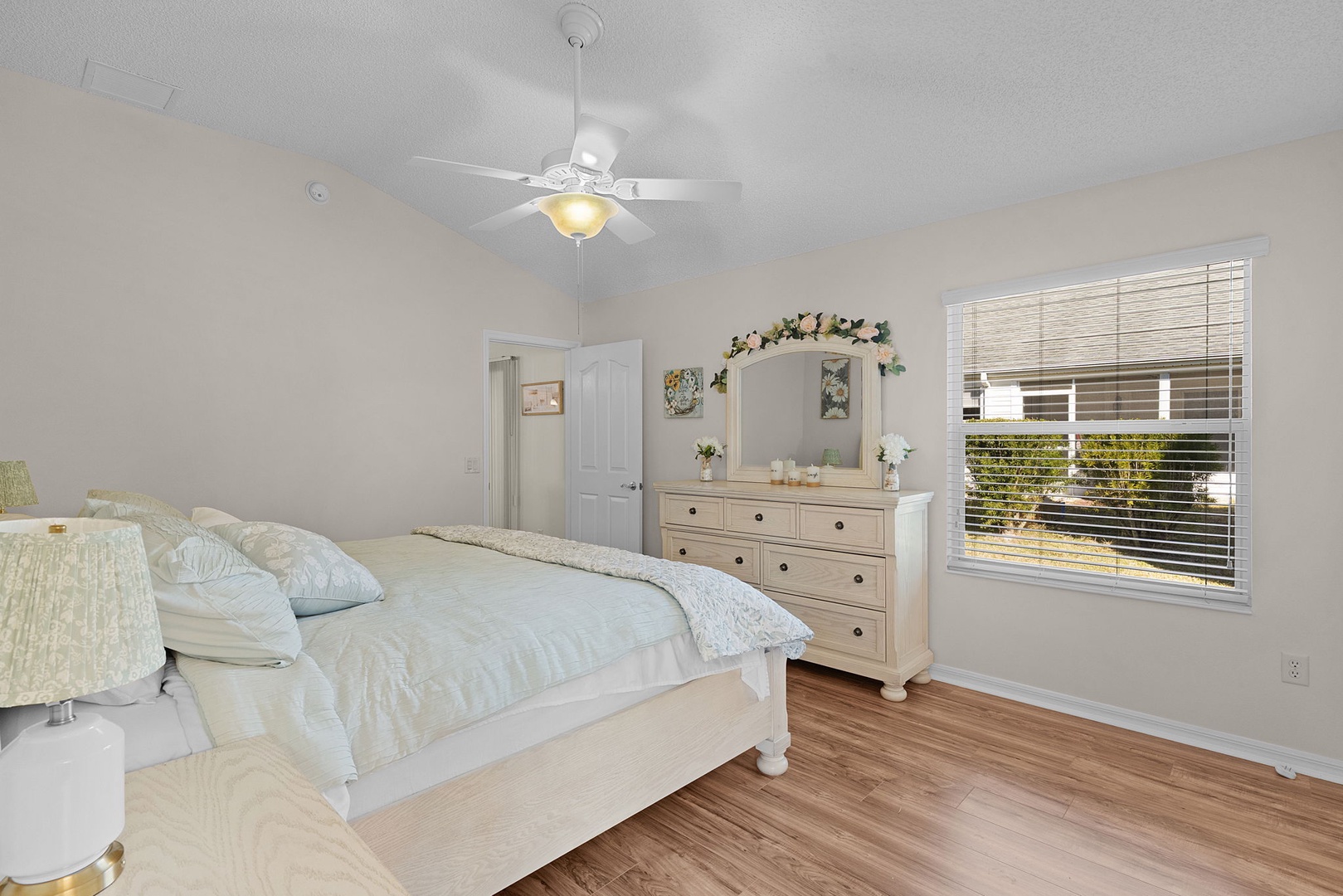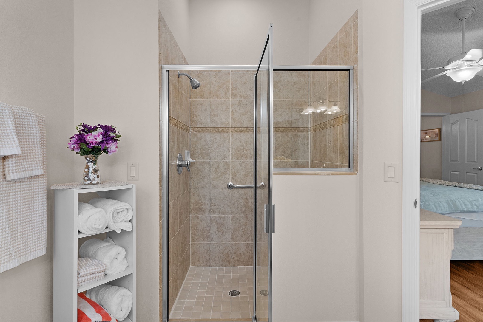 The spacious primary suite includes a king-size bed, walk-in closet, and a private ensuite bathroom with a walk-in shower and dual sinks. The guest bedroom is furnished with a queen-size bed and TV, while the guest bathroom includes a convenient tub/shower combination.