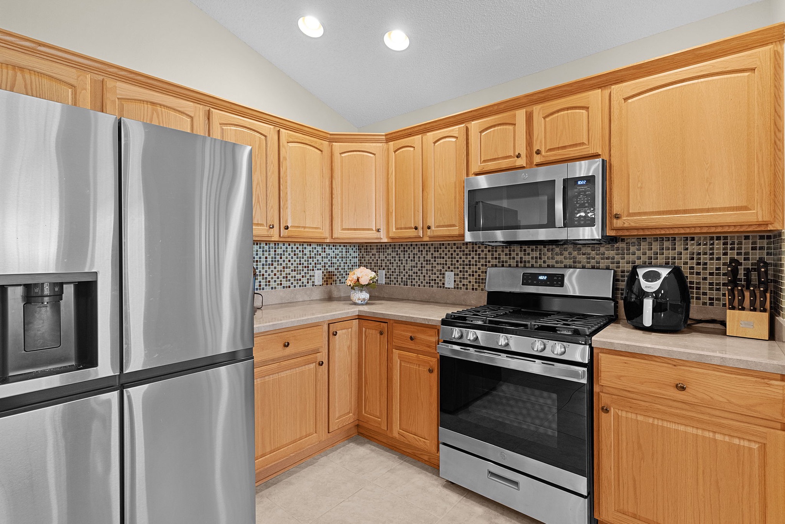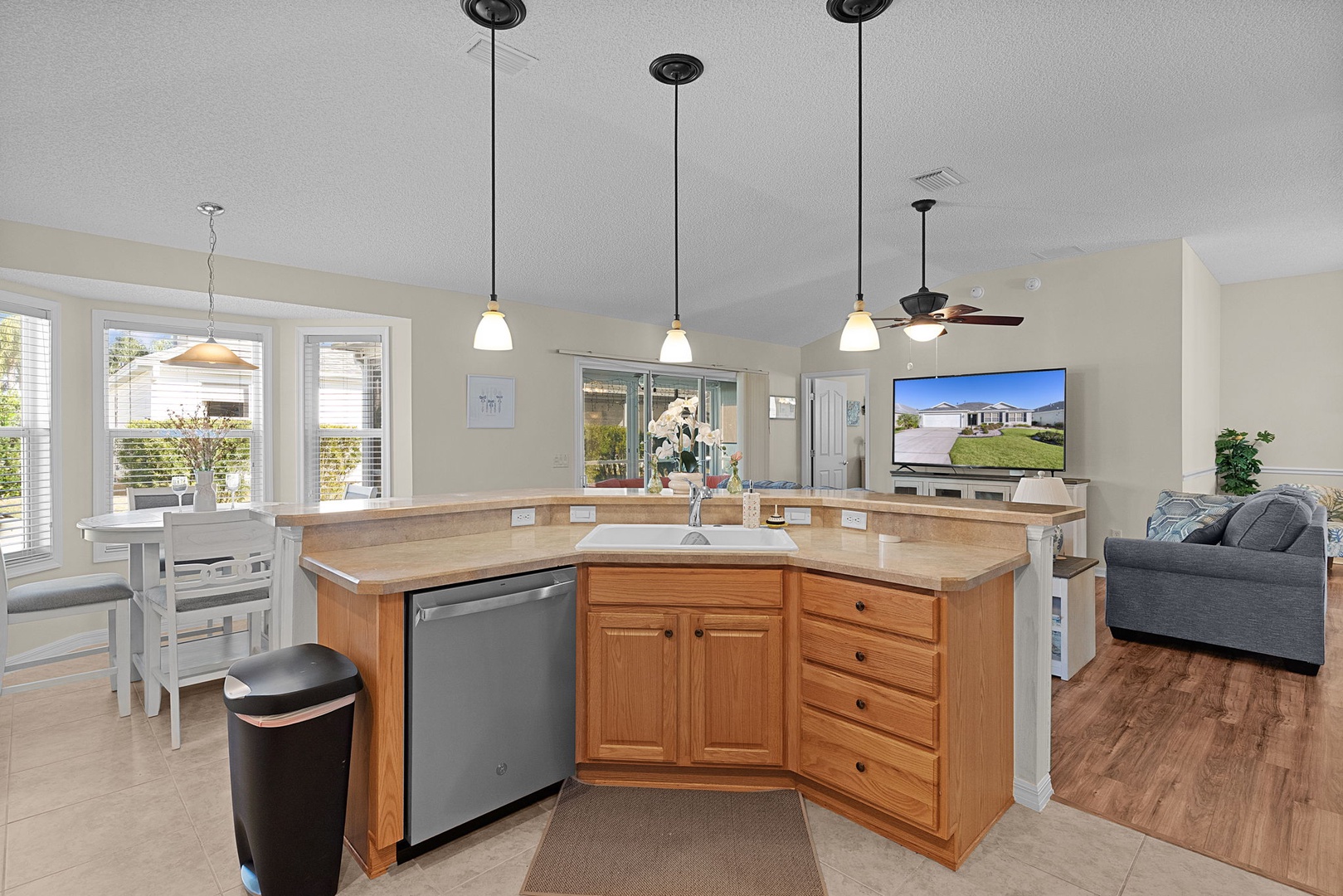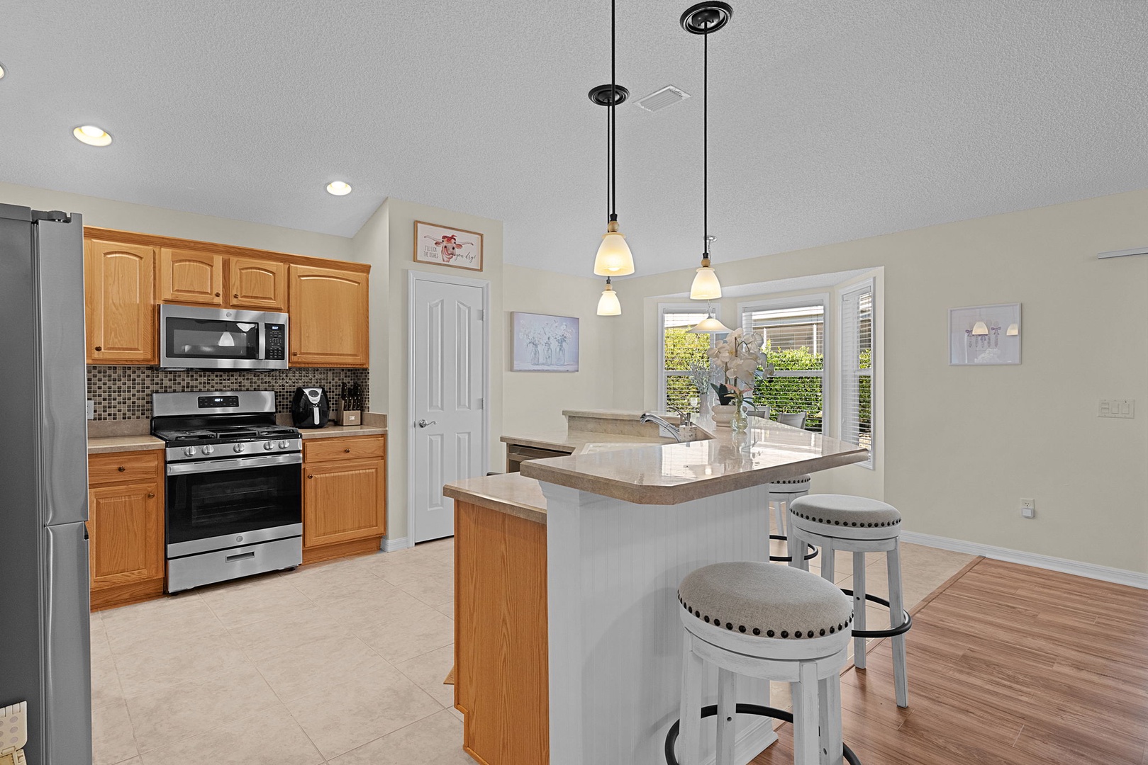 The open kitchen features stainless steel appliances, rich wood cabinetry, a pantry, and generous seating with bar seating for four and a dining table that comfortably seats four—perfect for entertaining or casual meals.