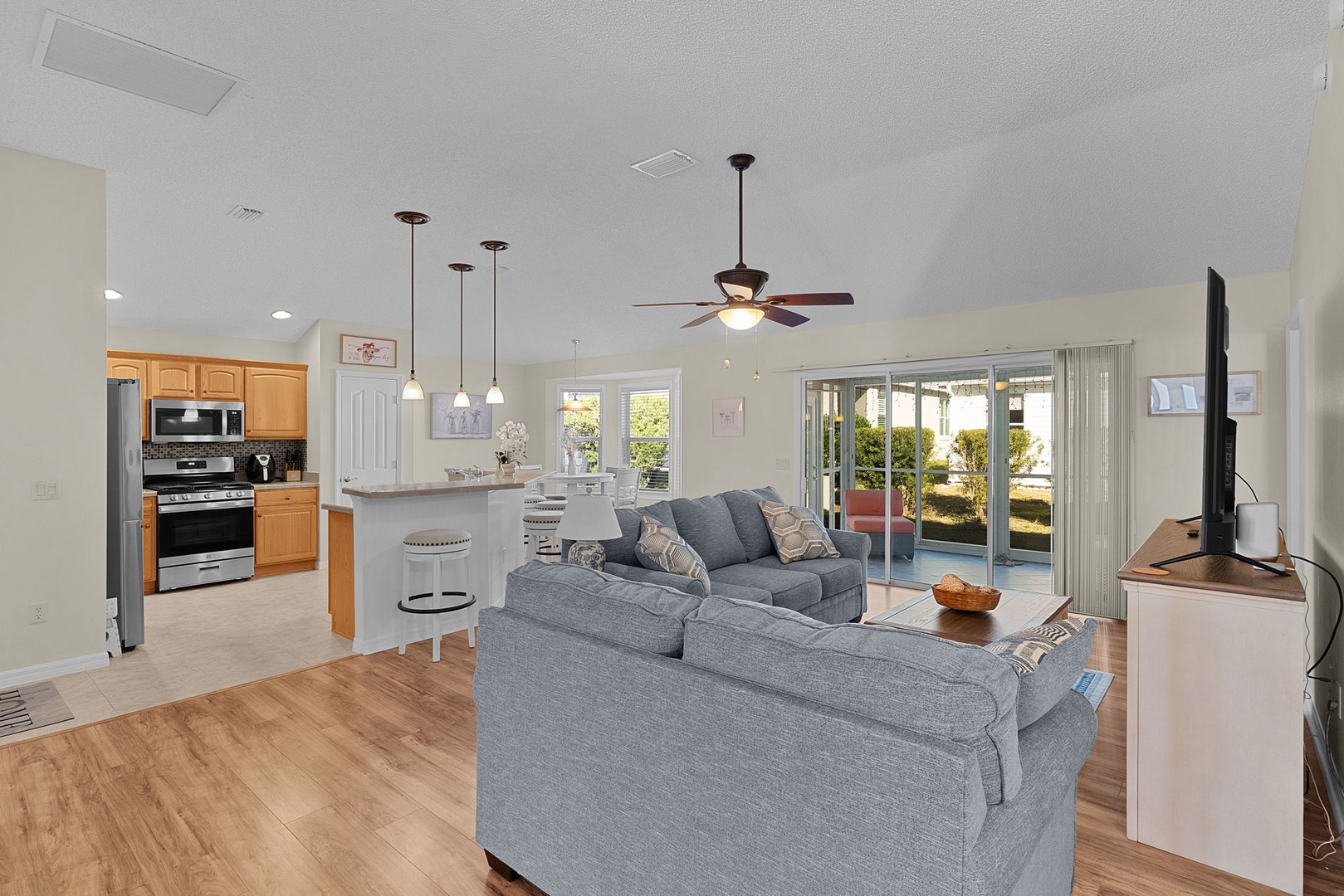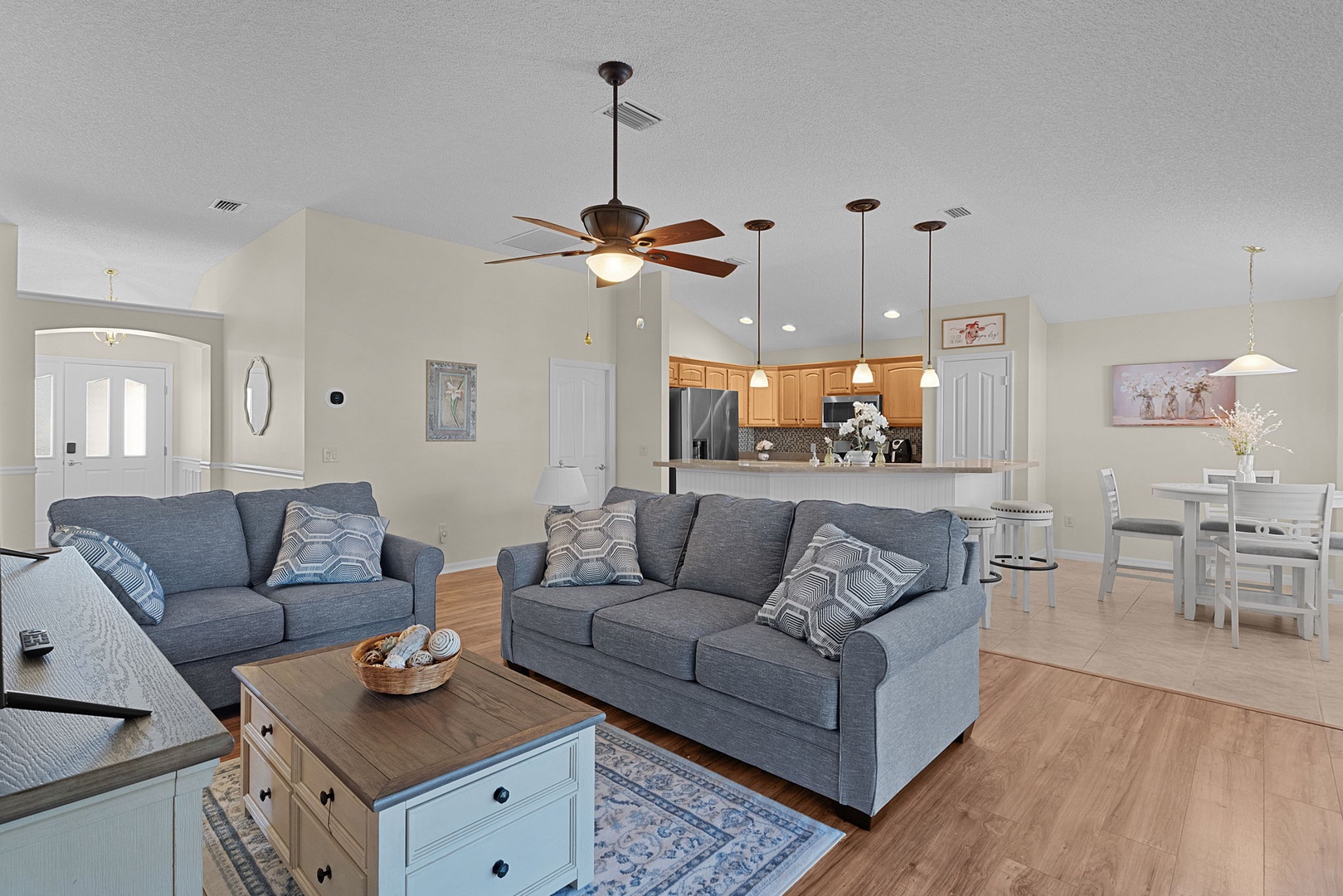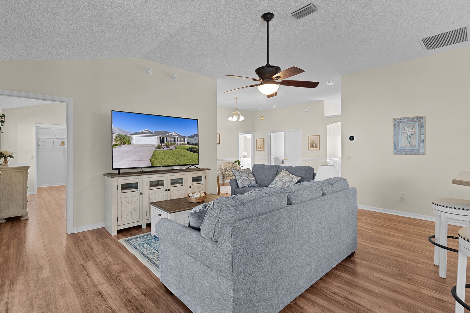 The living room offers a welcoming sitting area with a couch and loveseat, centered around a Smart TV for relaxing evenings at home.